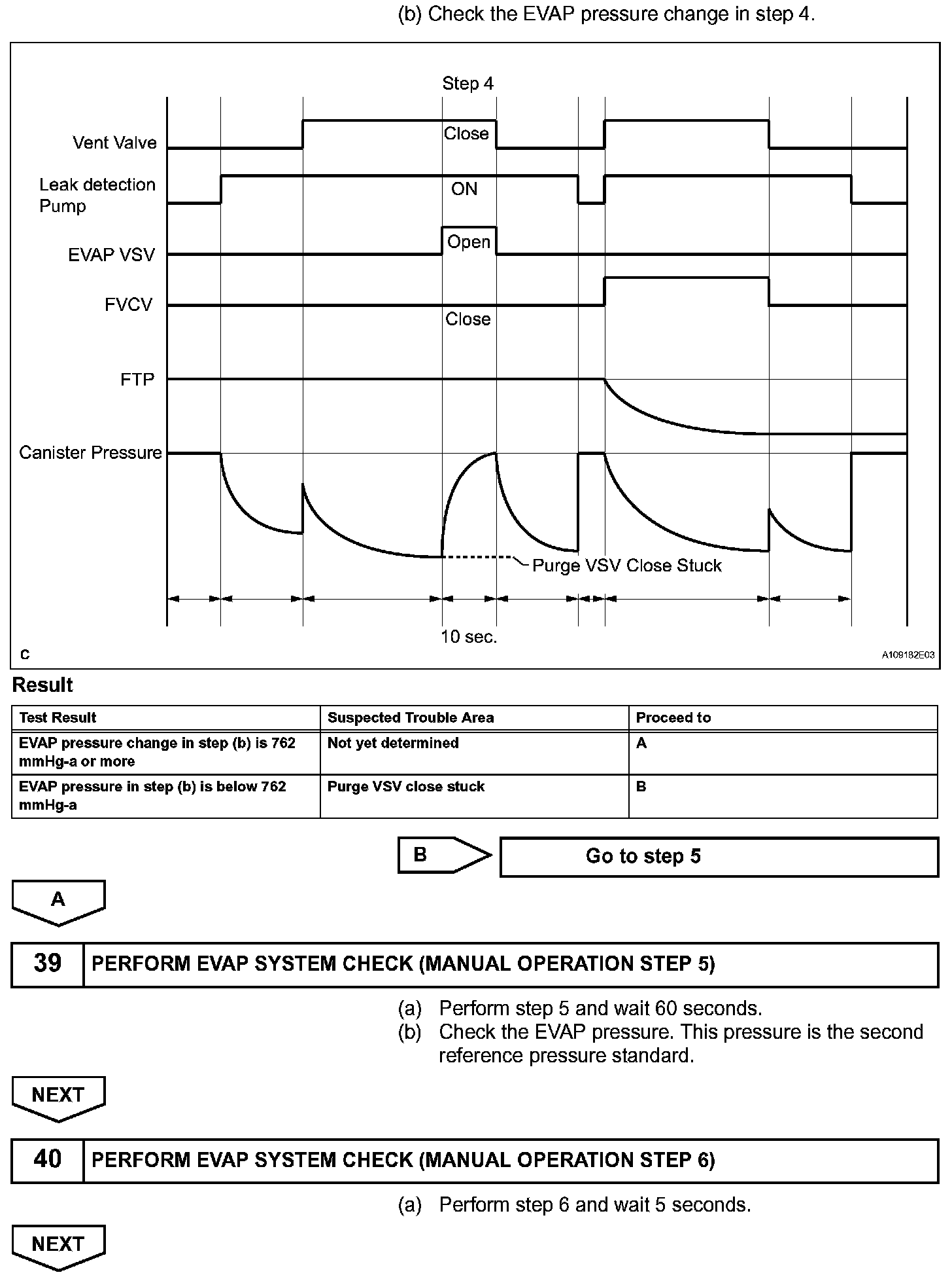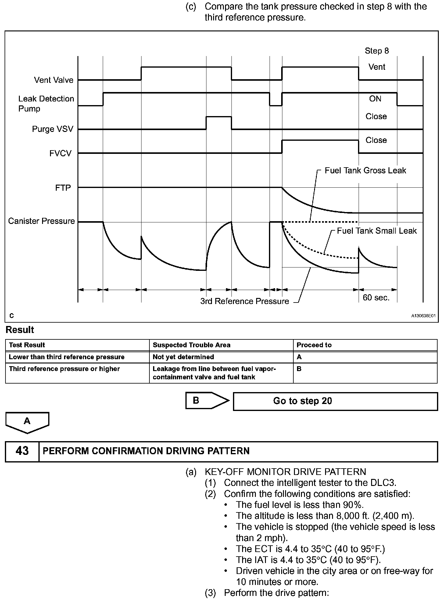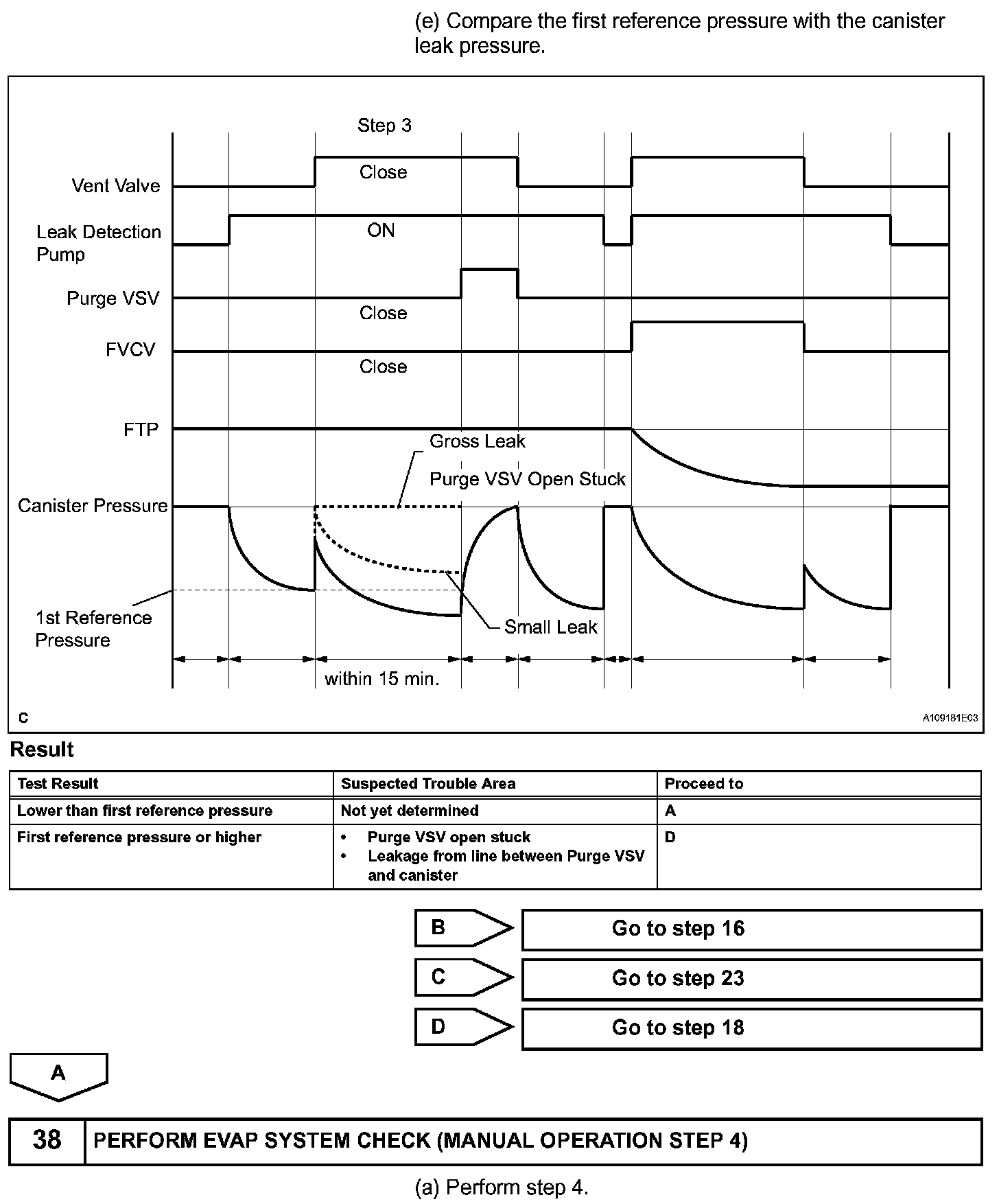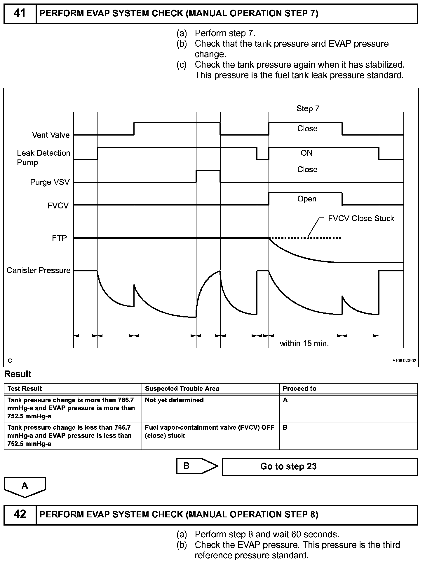 1. If the fuel tank pressure is higher or lower than the atmospheric pressure, the system determines that there are no leaks in the closed tank system and the system will check for leaks from the piping and canister between the purge VSV and canister pump module. (Method A)
