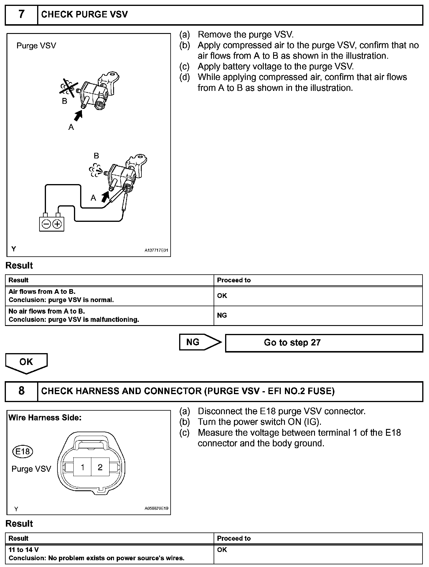 If EVAP system pressure change is less than 7.5 mmHg (1 kPa) when the engine is running and the purge VSV is turned ON (closed), the ECM determines that the purge flow is insufficient.