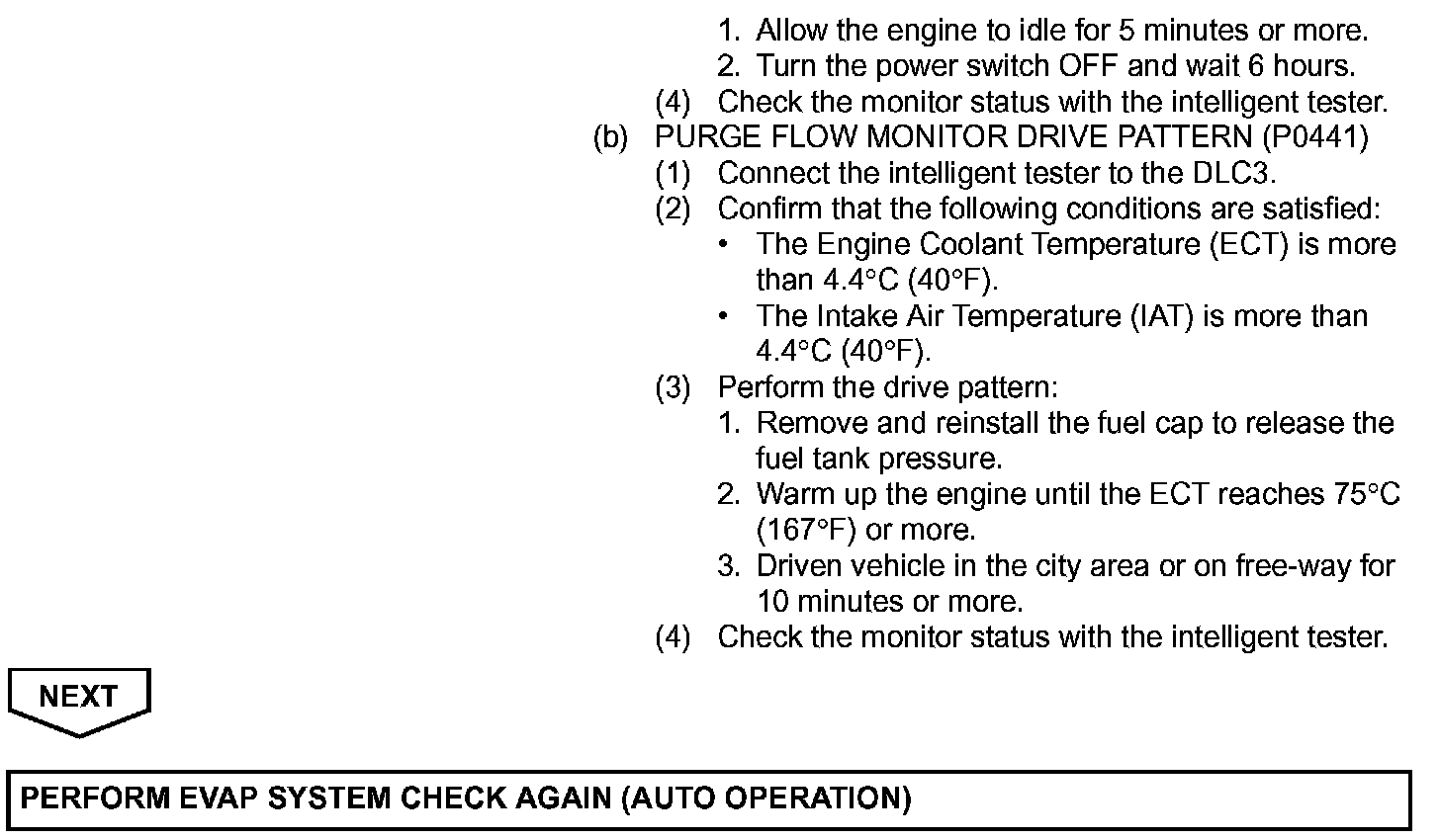 HINT: If the engine coolant temperature is 35 °C (95 °F) or more, 5 hours after the power switch has been turned OFF, the ECM will begin performing a monitor check after another 2 hours. If the engine coolant temperature is still 35 °C (95 °F) or more, 7 hours after the power switch has been turned OFF, the ECM will begin performing a monitor check after another 2.5 hours.