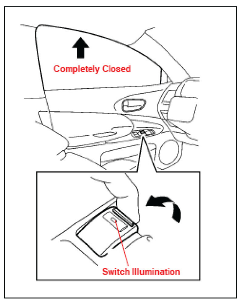 3. Pull up the driver's door power window switch until the window closes, and continue to hold it up for approximately one second.