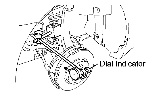 b. Using a dial indicator, measure the disc runout 10 mm (0.39 inch) away from the outer edge of the disc.