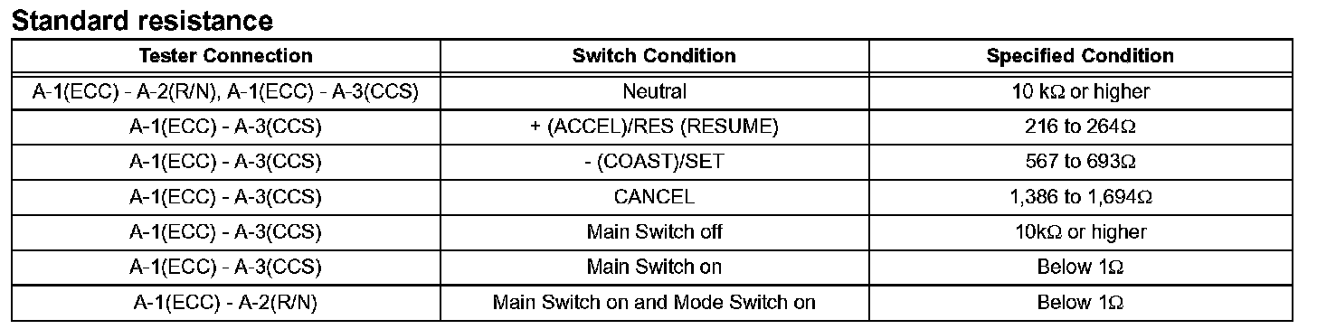 If the result is not as specified, replace the cruise control main switch
