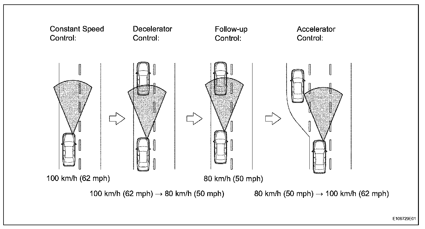 b. This system maintains the vehicle running at the speed that the driver has set, as long as there are no vehicles ahead in the same lane. Then, the system maintains the vehicle distance that has been set by the driver. If the system detects a vehicle driving at a slower speed ahead while the driver is driving at a constant speed, it closes the throttle valve to decelerate. If further deceleration is required, the system controls the brake actuator in order to apply the brakes. Thereafter, if there are no vehicles ahead within the set vehicle-to-vehicle distance because either the vehicle ahead or the driver has changed lanes, the system accelerates slowly to reach the set vehicle speed and resumes driving at the constant speed.