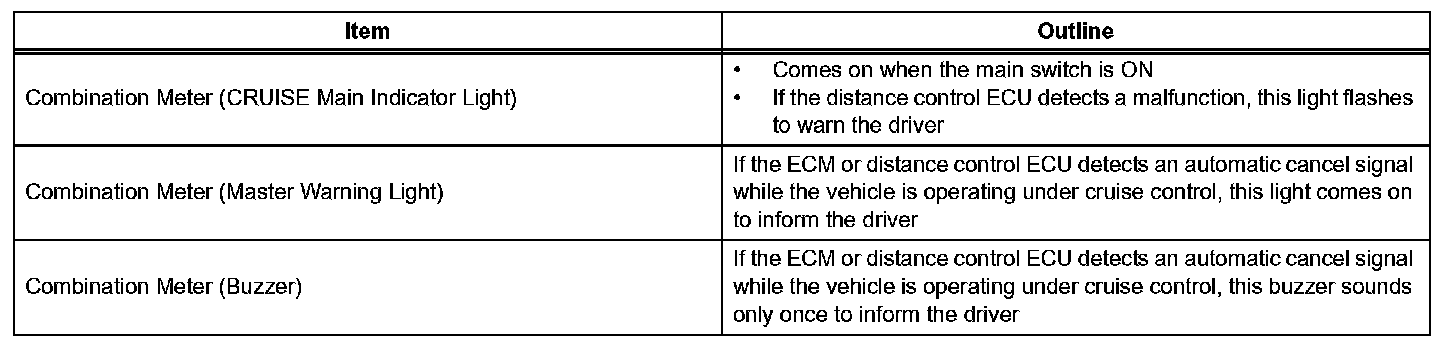 The cruise control main switch operates 8 functions: SET, - (COAST), TAP-DOWN, RES (RESUME), + (ACCEL), TAP-UP, CANCEL, and MODE. The SET, TAP-DOWN, and - (COAST) functions, and the RES (RESUME), TAP-UP, and + (ACCEL) functions are operated with the same switch. The cruise control main switch assembly is an automatic return type switch which turns on only while operating it in the direction of each arrow and turns off after releasing it. The dynamic radar cruise control system has two cruise control modes: the constant speed control mode and vehicle-to-vehicle distance control mode.