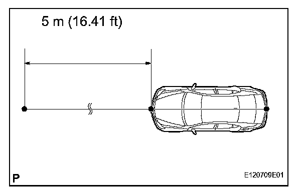 2. Set one end of the 10 m (32.82 ft) string on the vehicle's rear center point. Run the string over the vehicle's front center point to a position 5 m (16.41 ft) beyond the vehicle front center point, as shown in the illustration. Mark the 5 m (16.41 ft) position.