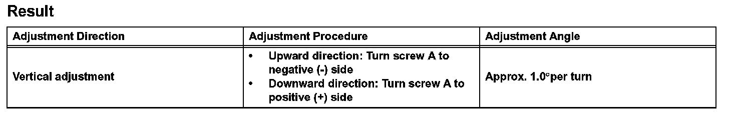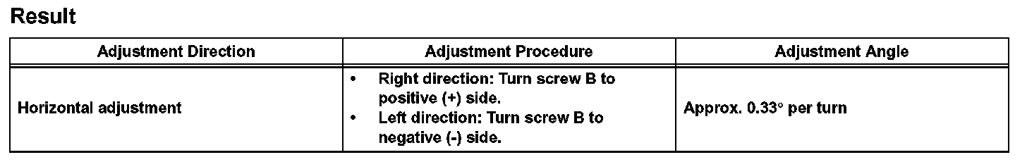 - If "LEFT SIDE: 1.0 °" is displayed, the divergence is 1.0 ° in the left direction. Turn screw B approximately 3 turns to the negative (-) side.