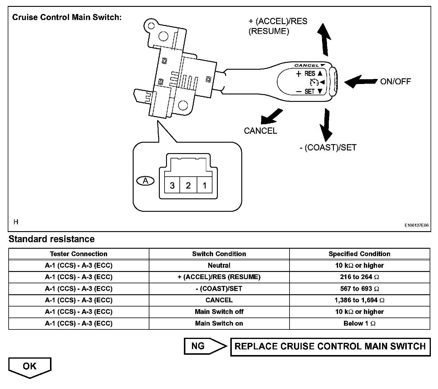 The cruise control main switch operates 7 functions: SET, - (COAST), TAP-DOWN, RES (RESUME), + (ACCEL), TAP-UP, and CANCEL. The SET, TAP-DOWN, and - (COAST) functions, and the RES (RESUME), TAP-UP, and + (ACCEL) functions are operated with the same switch. The cruise control main switch is an automatic return type switch which turns on only while operating it in the direction of each arrow and turns off after releasing it. The internal contact point of the cruise control main switch is turned on with the switch operation. Then the ECM reads the voltage value that has been changed by the switch operation to control SET, - (COAST), RES (RESUME), + (ACCEL), and CANCEL.