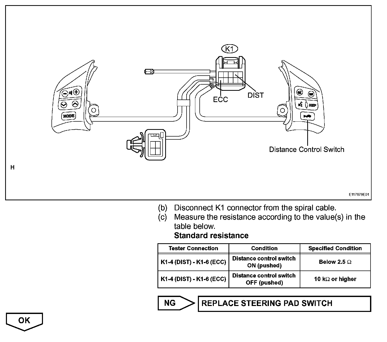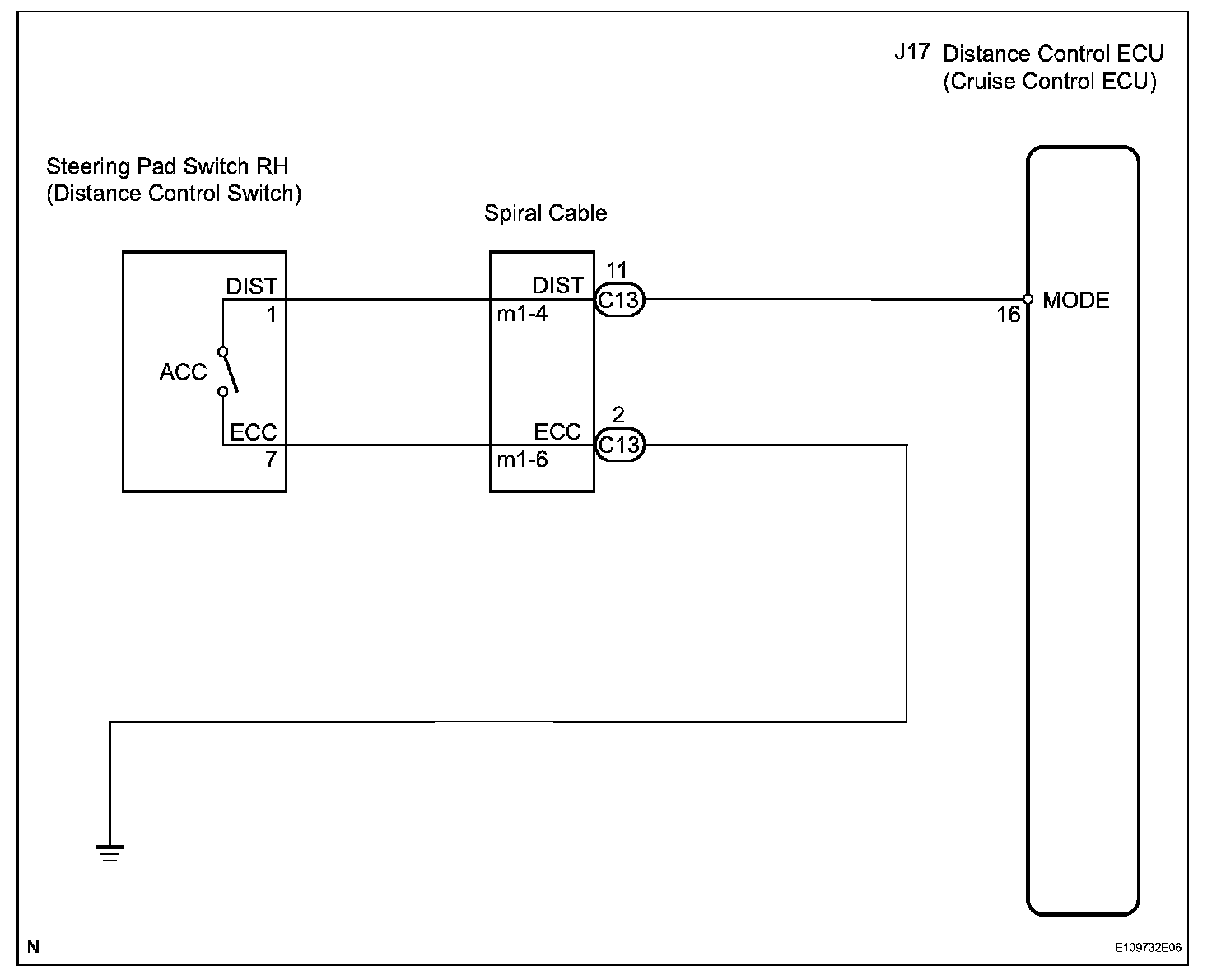 The distance control switch sets the vehicle-to-vehicle distance control mode. The distance control switch is installed in the steering pad switch. The vehicle-to-vehicle distance set value can be changed by operating the steering pad switch (distance control switch) while the dynamic radar cruise control system is in operation. The steering pad switch uses the BEAN to communicate with each ECU. Therefore, it does not have a direct connection with the ECM. If there are any malfunctions in the communication line of the steering pad switch, one or more DTCs in the multiplex communication system are output.