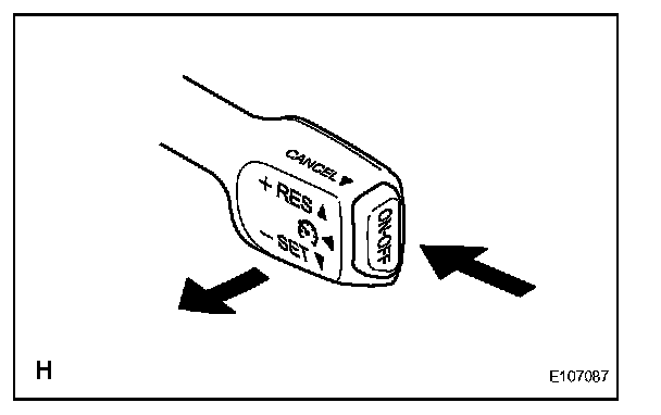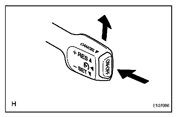 4. Check that vehicle speed increases while the cruise control main switch is pushed to + (ACCEL)/RES (RESUME), and that the vehicle cruises at the newly set speed when the switch is released.