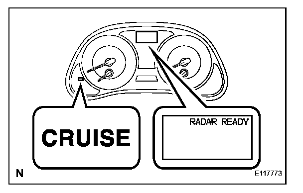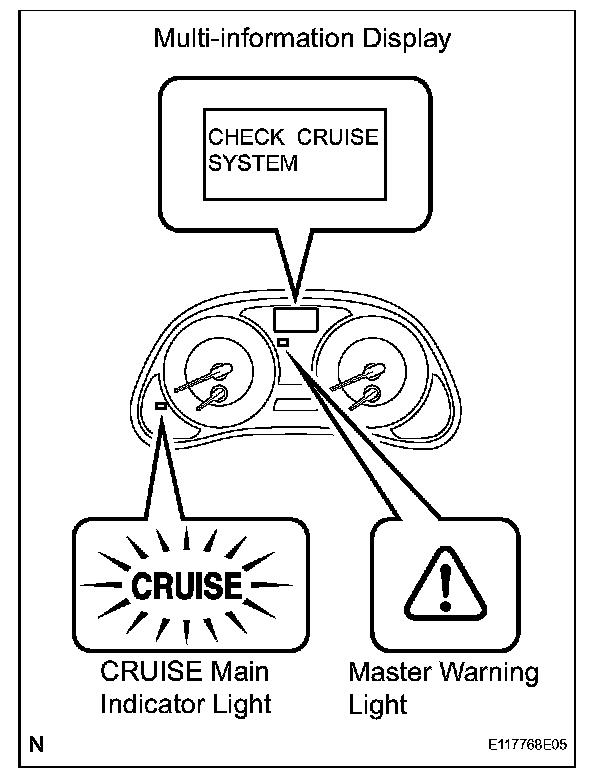 a. The diagnosis function makes the master warning light and the multi-information display come on, and the CRUISE main indicator light blinks as shown in the illustration. When a malfunction occurs in the dynamic radar cruise control system, the DTCs are stored in the ECM.