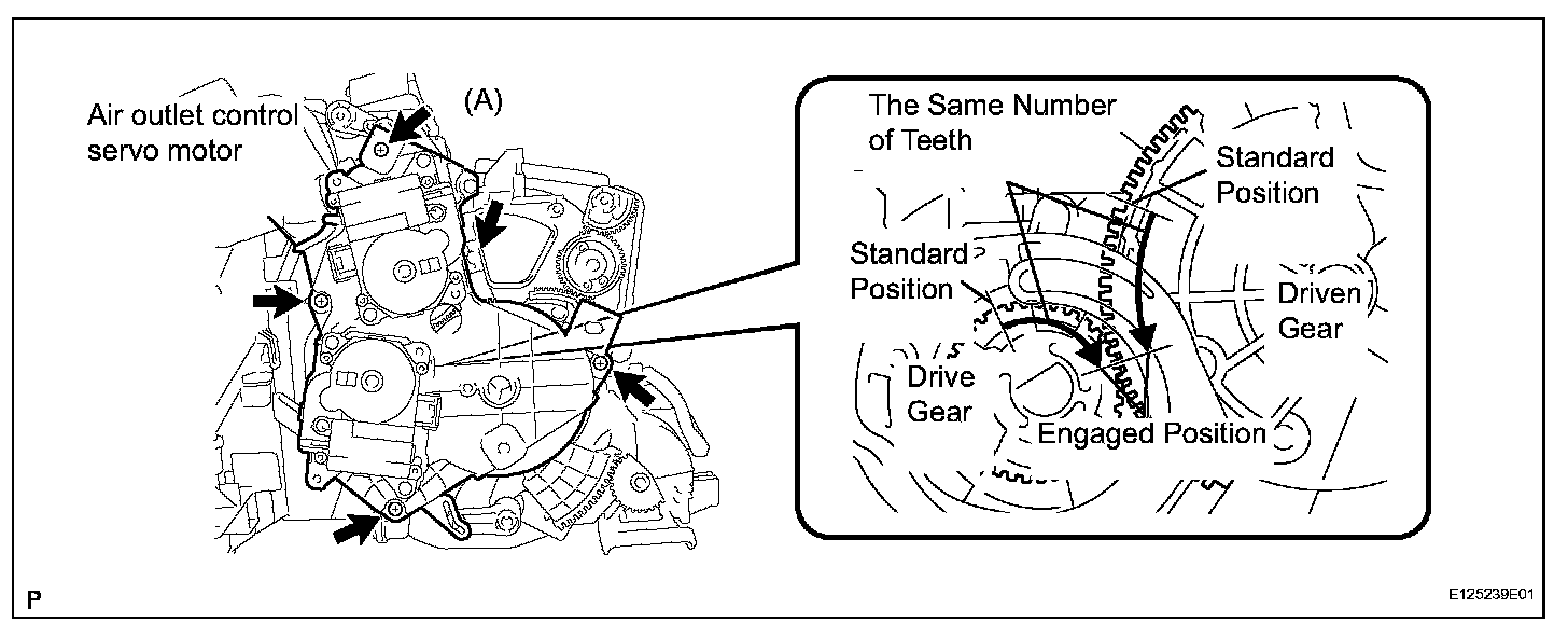 d. Slightly lift the air outlet control servo motor. Check that the drive gear and the driven gear are engaged at a point with the same number of gear teeth from the standard position from the view indicated by arrow (A).