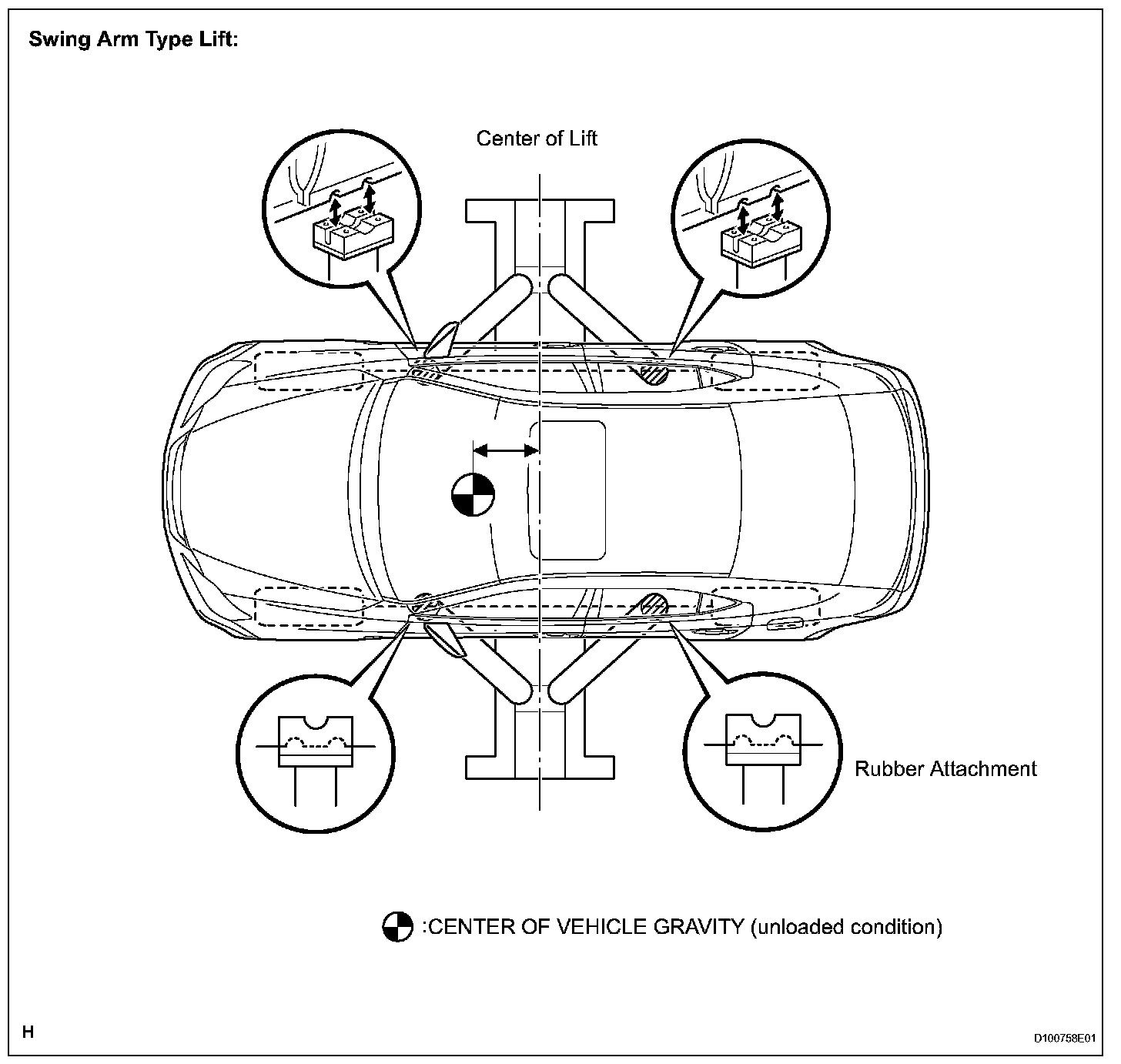 d. Place the vehicle horizontally by adjusting the height of the cradle, and match the groove of the cradle and the safety stand support location accurately. e. Be sure to lock the swing arm during the operation.
