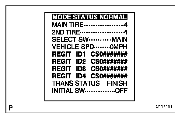 (f) If either of the conditions is not true, switch the tire select switch to "2nd" and perform steps Procedure "C" to Procedure "E". If both are true, the transmitter ID of the currently installed wheel is registered in "2nd".