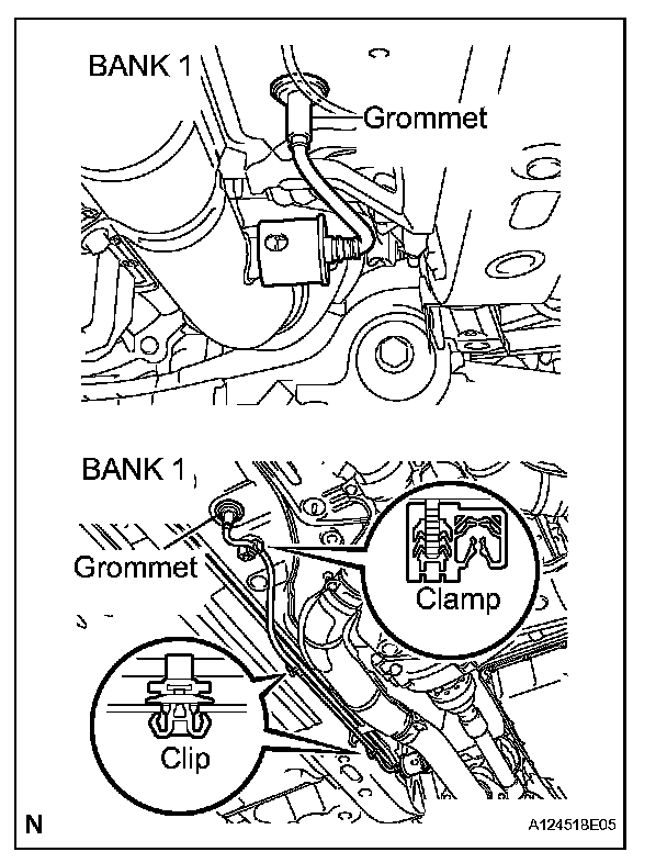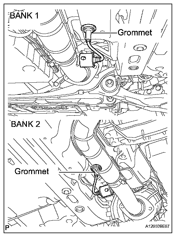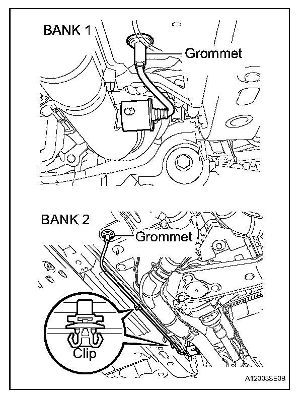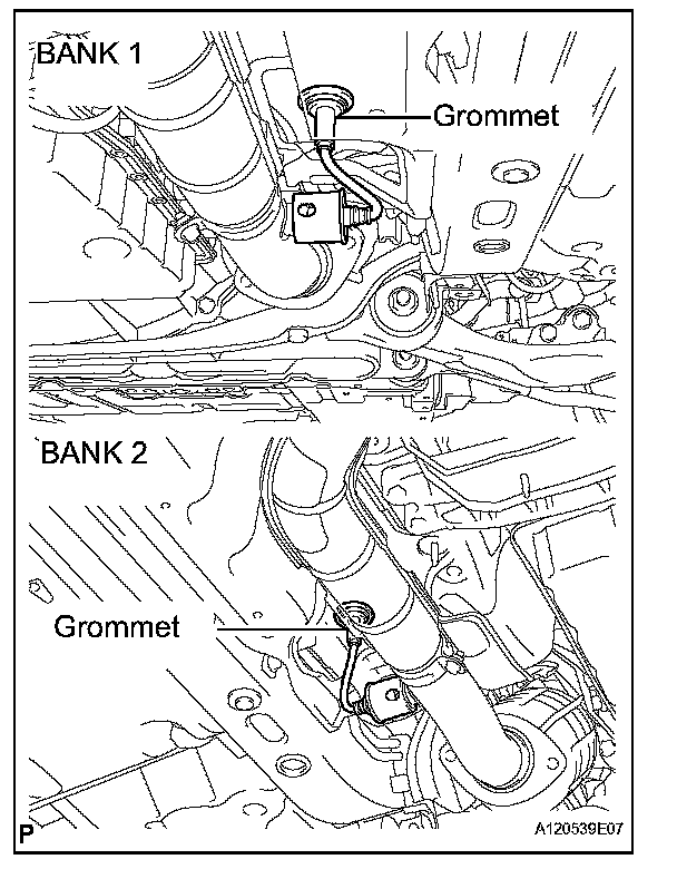 b. Pass the heated oxygen sensor connector through the floor panel and install the grommet.