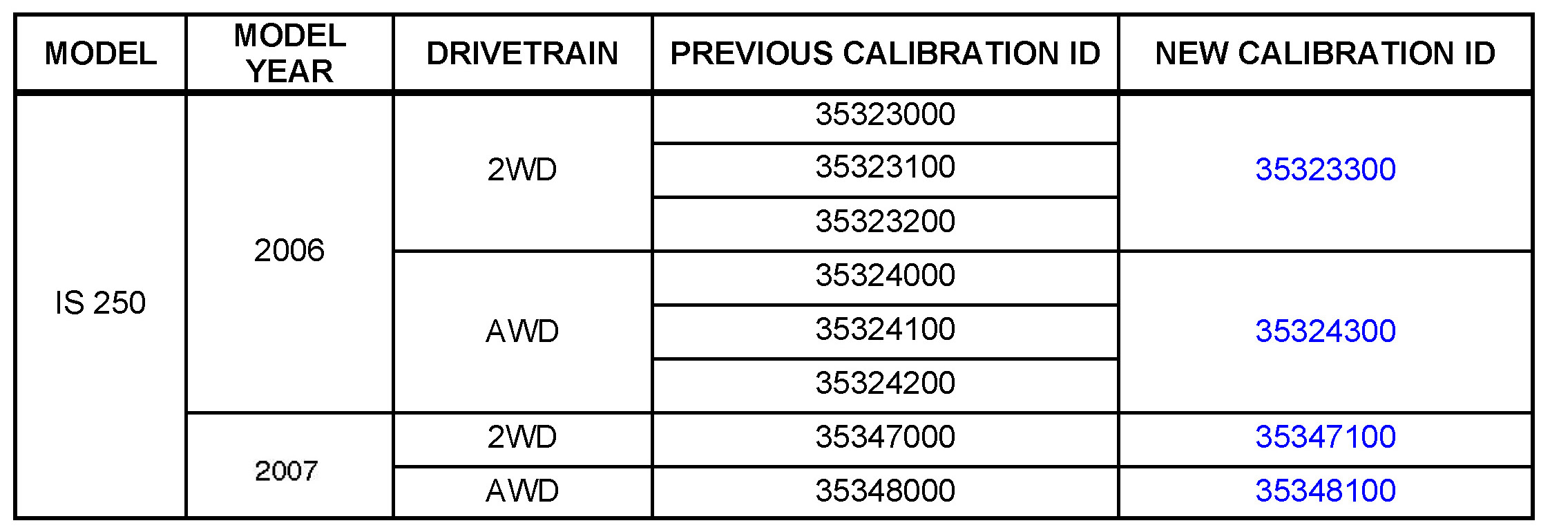 - 2006 - 2007 model year IS 250 vehicles equipped with the 4GR--FSE engine and automatic transmission, and produced BEFORE the Production Change Effective VINs shown below.