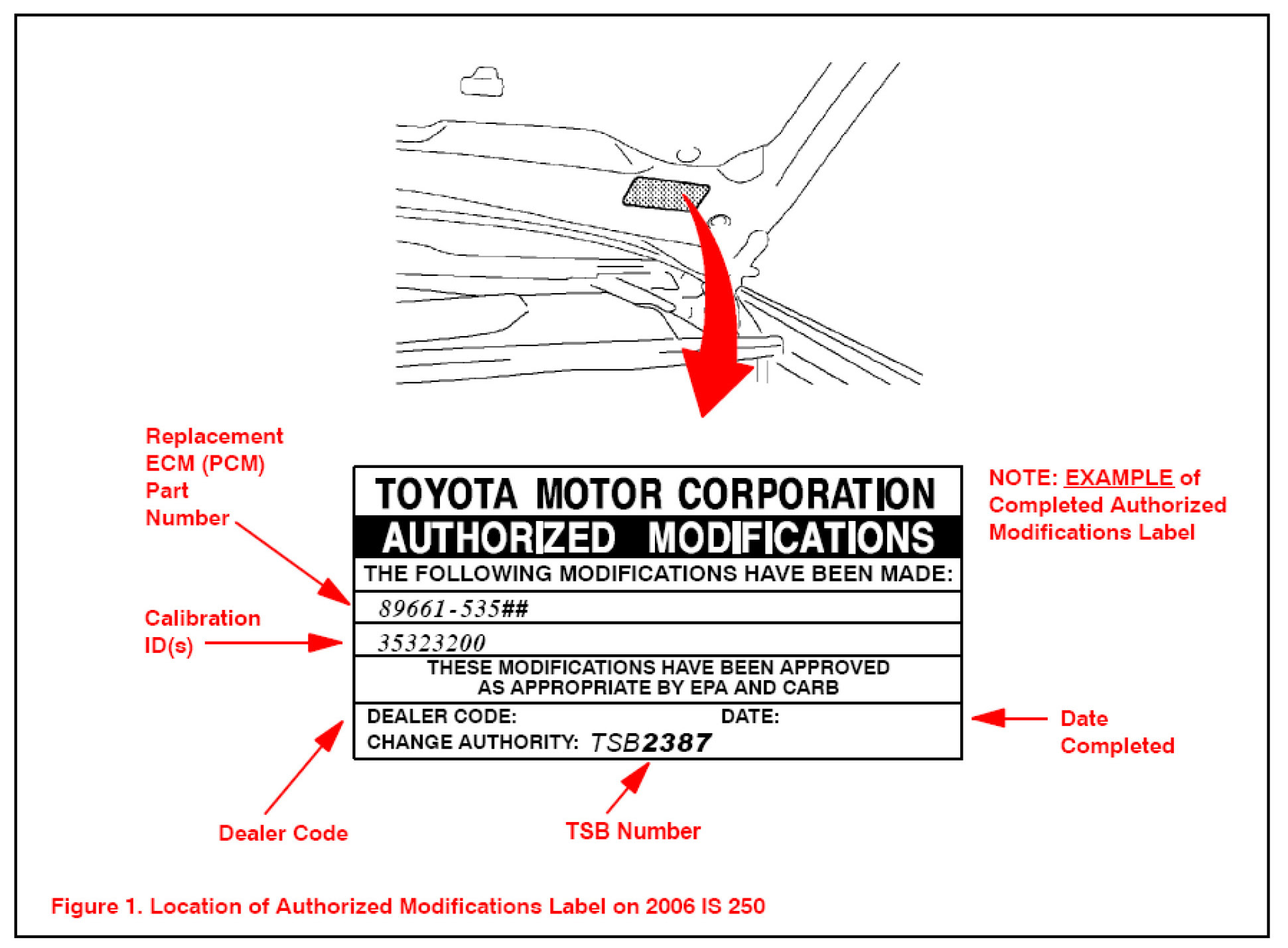 1. Check for the Authorized Modifications Label affixed to the vehicle in the location shown in Figure 1. Confirm if the ECM (PCM) calibration has been updated. If the calibration ID listed is NOT the latest ECM (PCM) calibration - go to step 2.