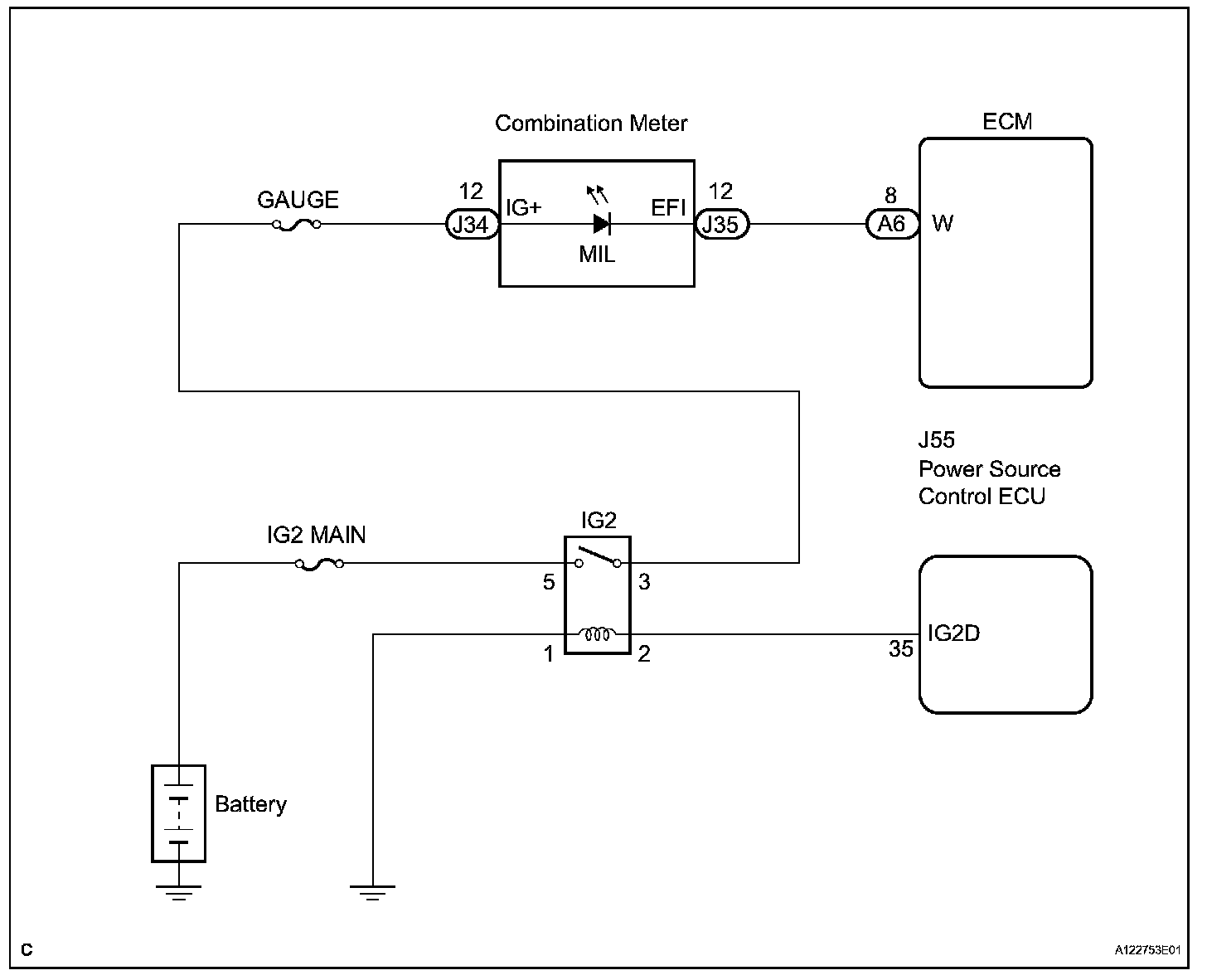 By turning the engine switch on (IG), power is supplied to the MIL circuit, and the ECM provides the circuit ground, which illuminates the MIL.