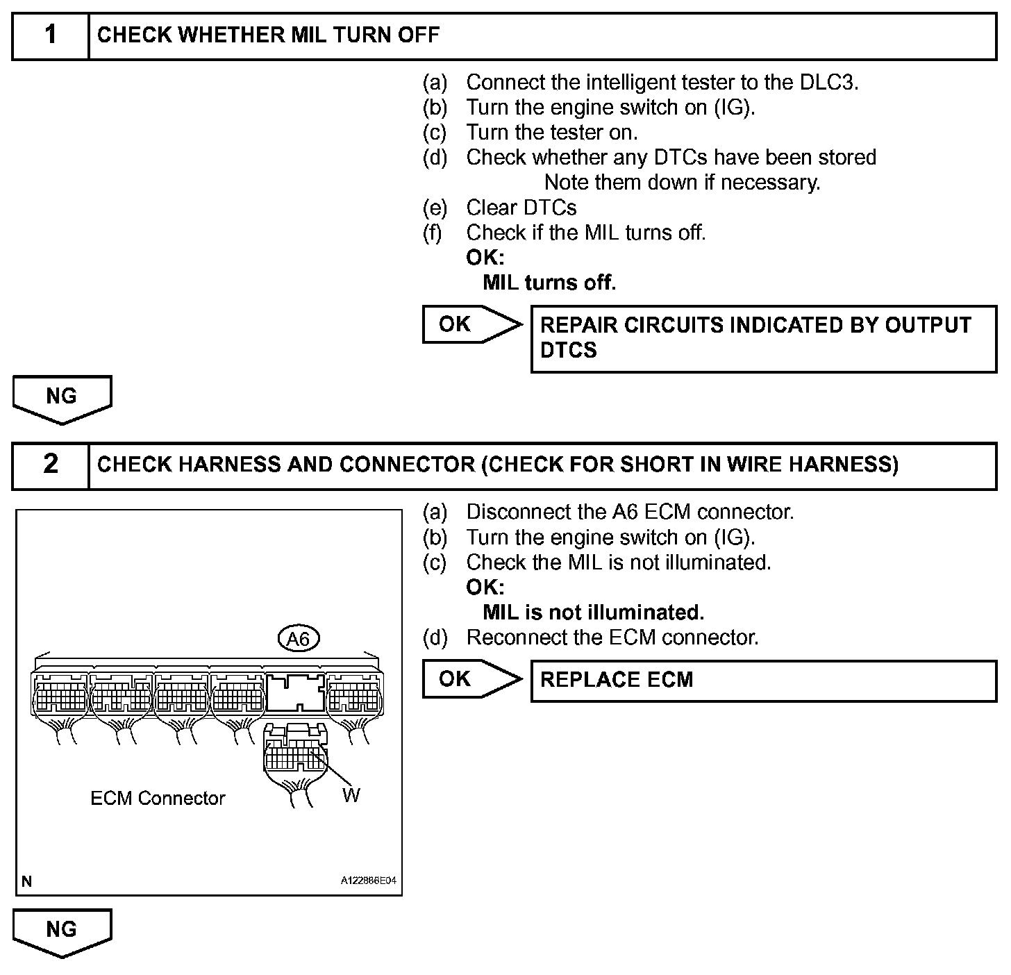 The MIL operation can be checked visually: When the engine switch is first turned on (IG), the MIL should be illuminated and should then turn off. If the MIL remains illuminated or is not illuminated, conduct the given troubleshooting procedure using the intelligent tester.
