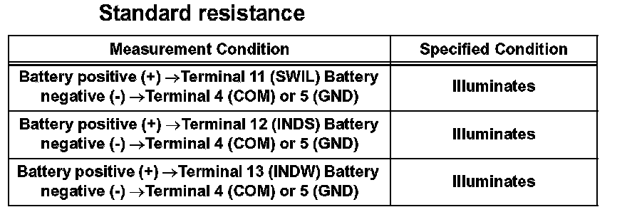 b. Apply battery voltage between the terminals of the switch, and check the illumination condition of the switch.