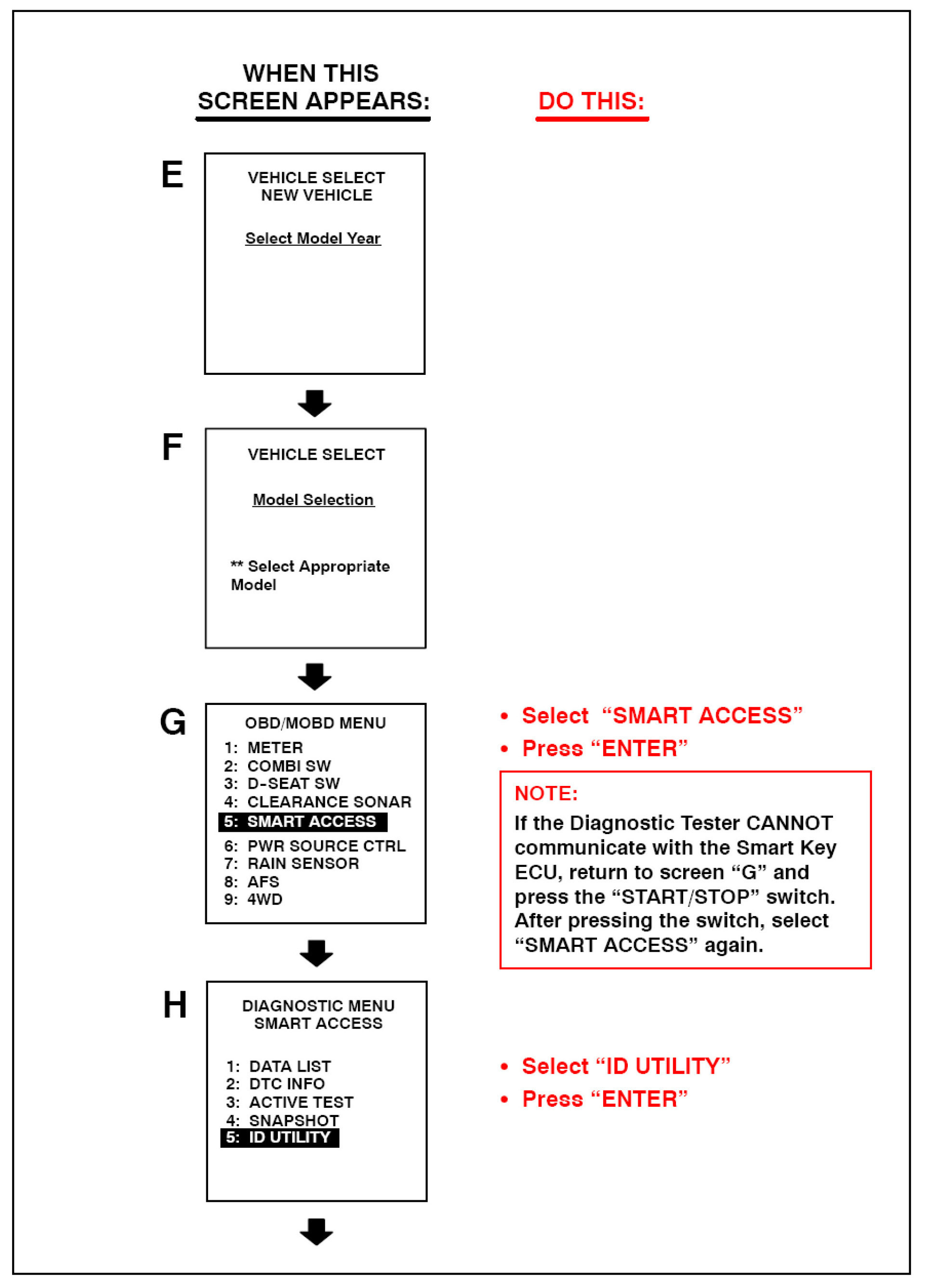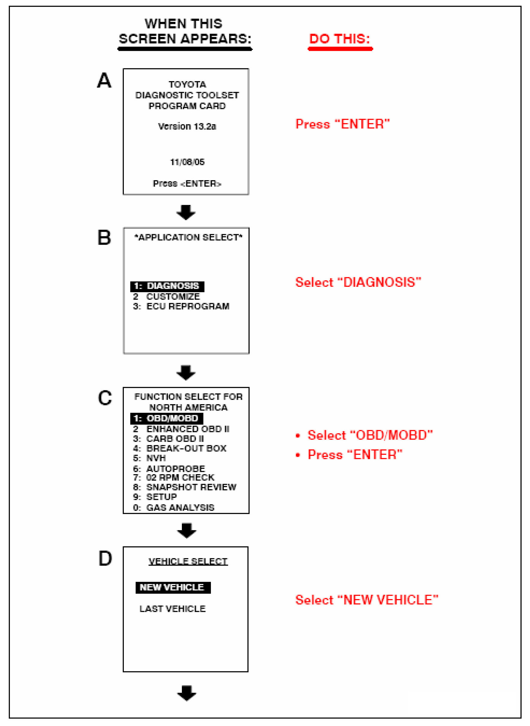 Follow the Diagnostic Tester screen flows. This procedure works best if you use the instructions under the "DO THIS" column and use the screen prints to know WHEN to perform the instructions only.