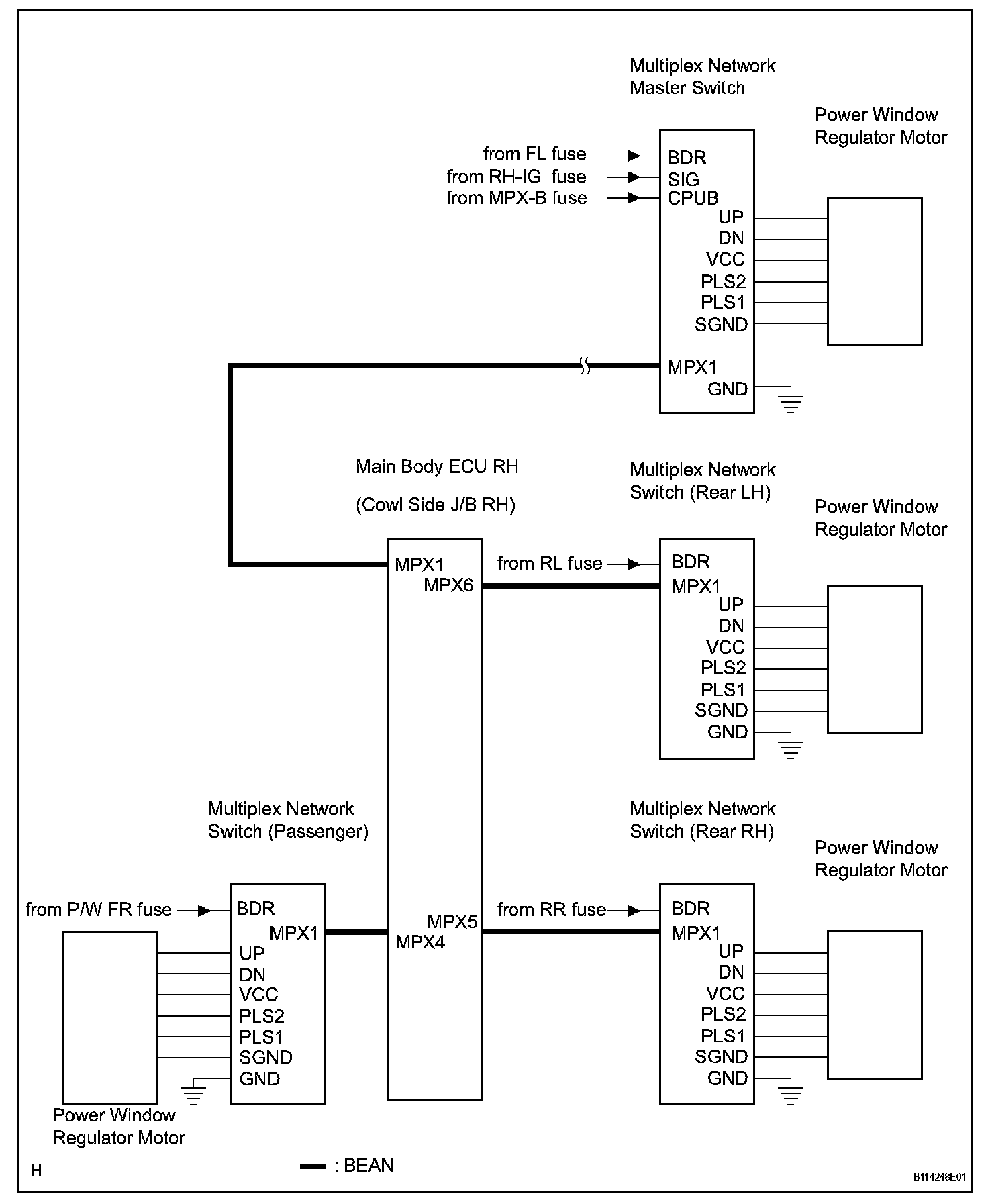 a. The power window control system controls the power window UP/DOWN function by using regulator motors. This system is mainly controlled by the multiplex network master switch built into the driver's door and multiplex network switches built into the passenger's doors. Pressing any of these multiplex network switches or the driver side door window switch mounted on the master switch transmits an UP/DOWN signal to the regulator motor for the corresponding power window, which then operates the power window UP/DOWN. Pressing any switch for the power windows except the driver's power window mounted on the master switch transmits a remote UP/DOWN signal to the main body ECU RH via the BEAN line. Then the main body ECU RH transmits this remote signal to the regulator switch for the corresponding power window via the BEAN line and activates the motor to open/close the power window.