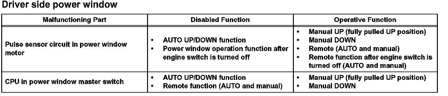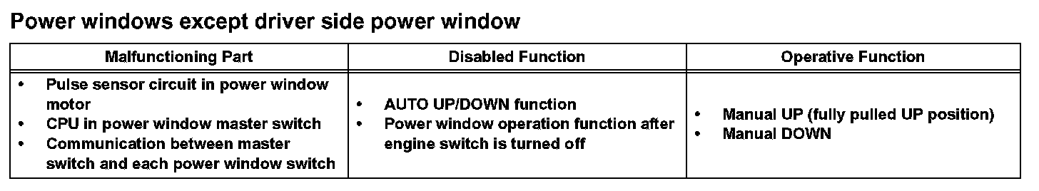 If there is a malfunction in the power window system, some of the power window functions will be disabled.