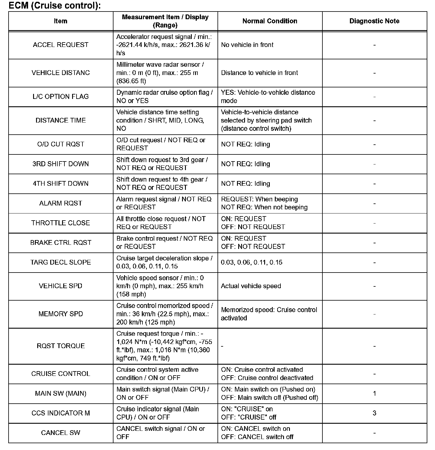 - 1 is OK, but CRUISE main indicator light does not illuminate -> Cruise main indicator light, wire harness, or ECM failure