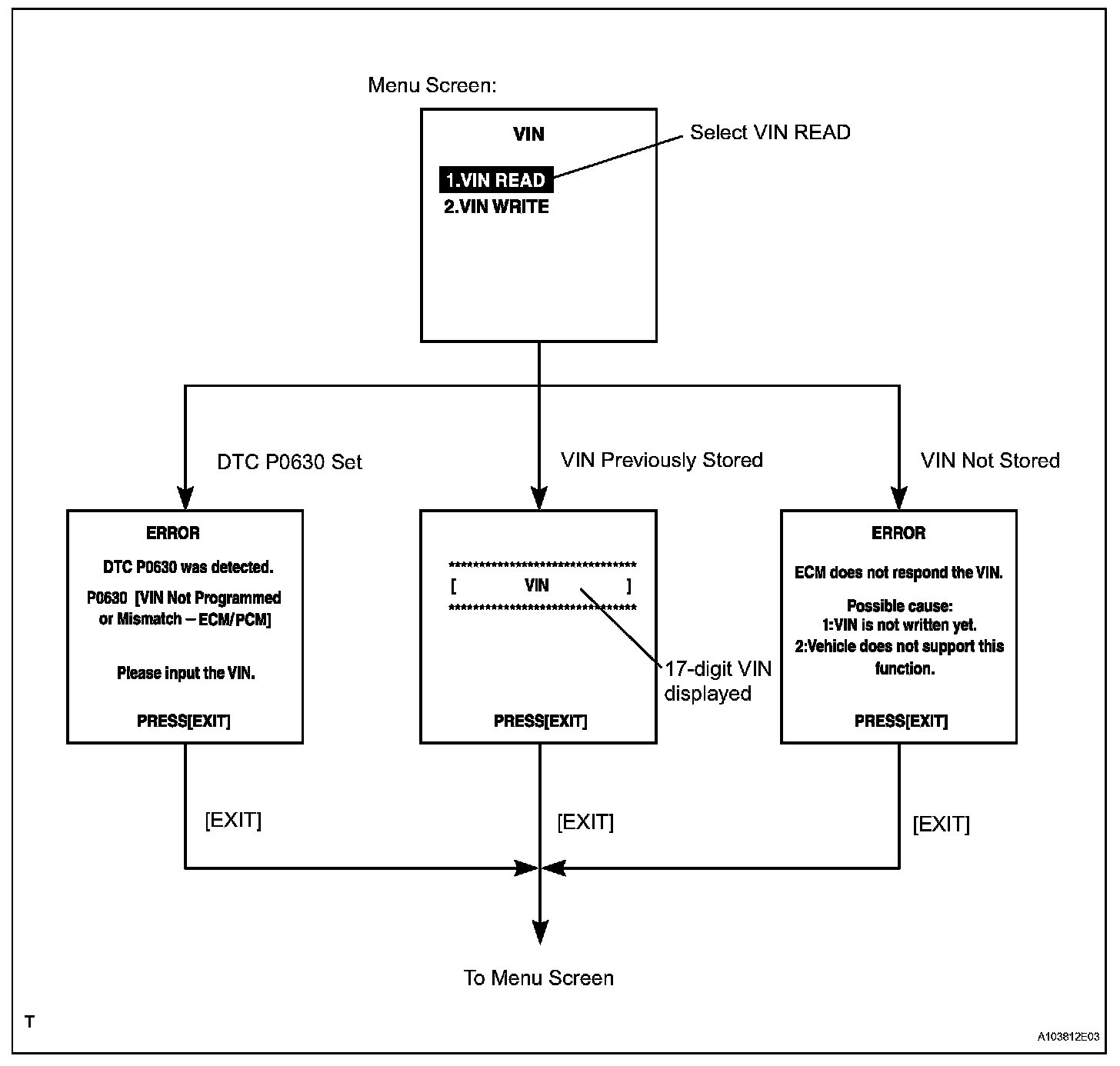 a. The flowchart of the VIN reading process is shown. This process allows the VIN stored in the ECM to be read, in order to confirm that the two VINs, provided with the vehicle and stored in the vehicle's ECM, are the same.