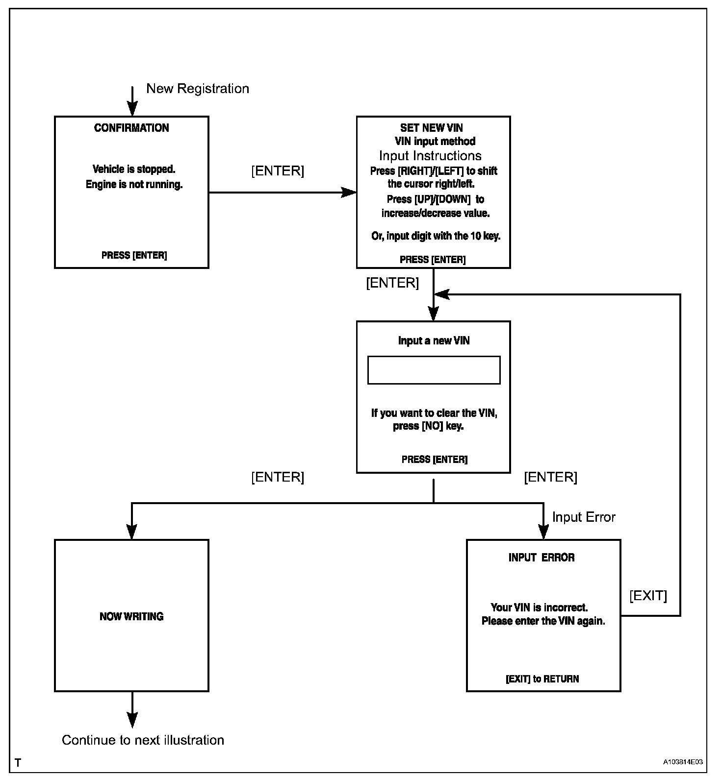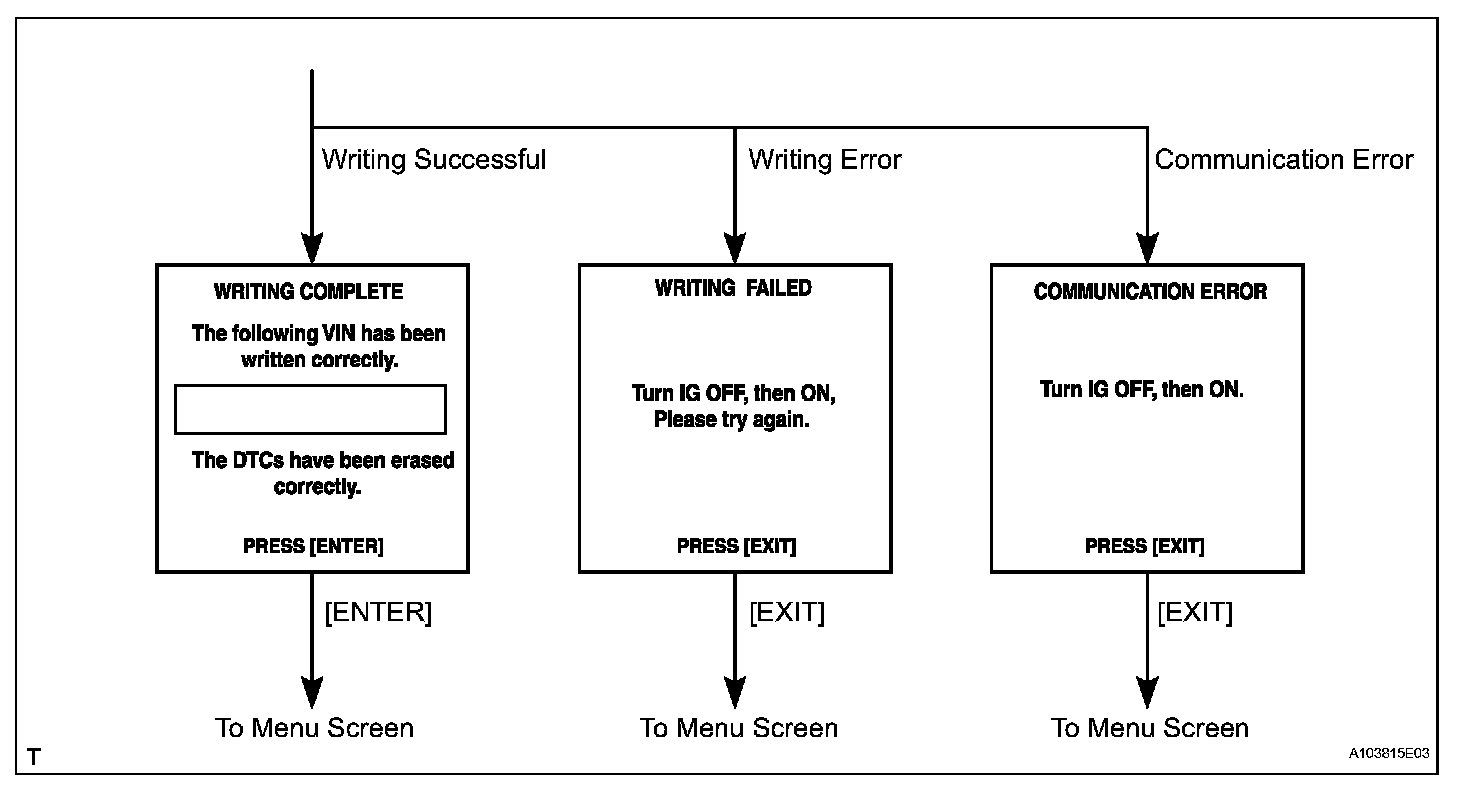 a. The flowchart of the VIN writing process is shown. This process allows the VIN to be input into the ECM. If the ECM is changed, or the VINs do not match, the VIN can be registered, or overwritten in the ECM by given this procedure.