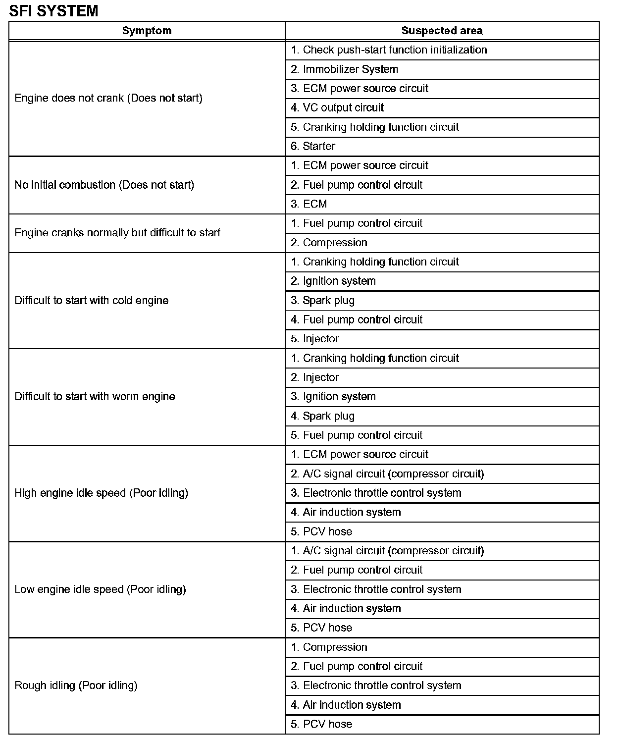 HINT: Use the table to help determine the cause of the problem. The potential cases of the symptoms are listed in order of probability in the "Suspected area" column of the table. Check each symptom by checking the suspected areas in the order they are listed. Replace parts as necessary.