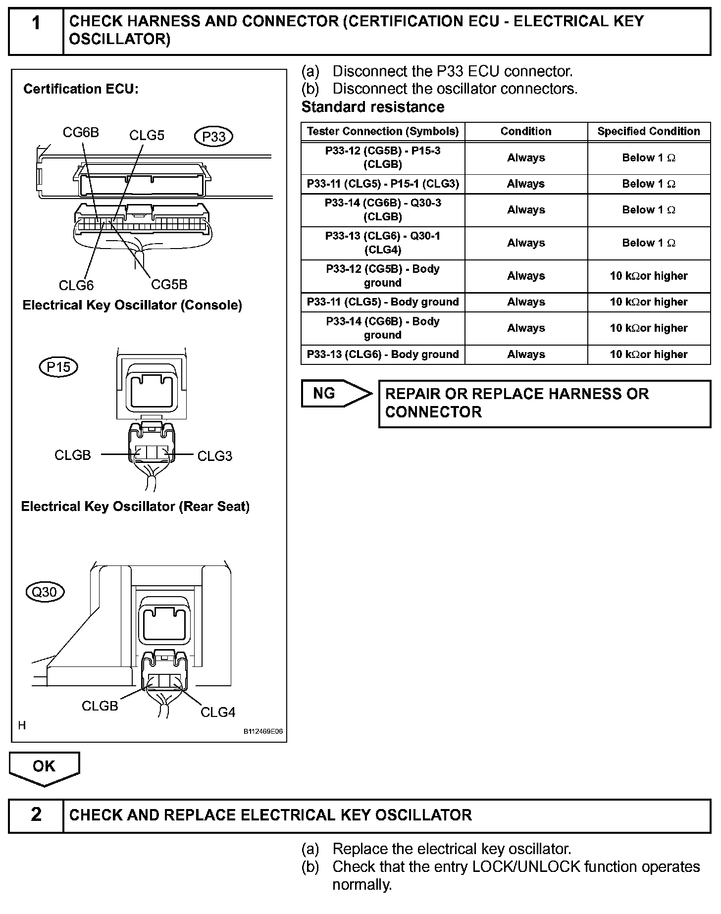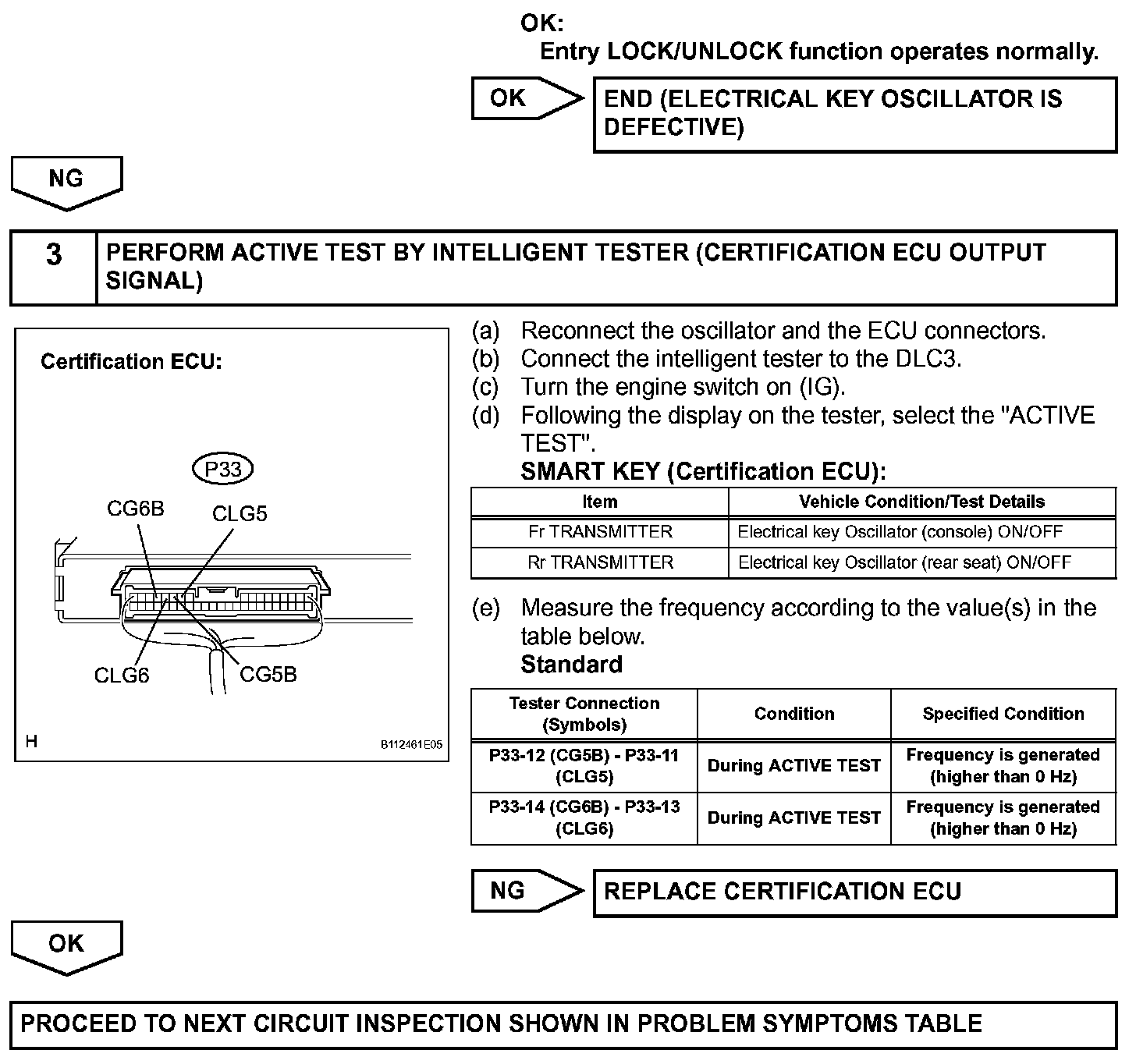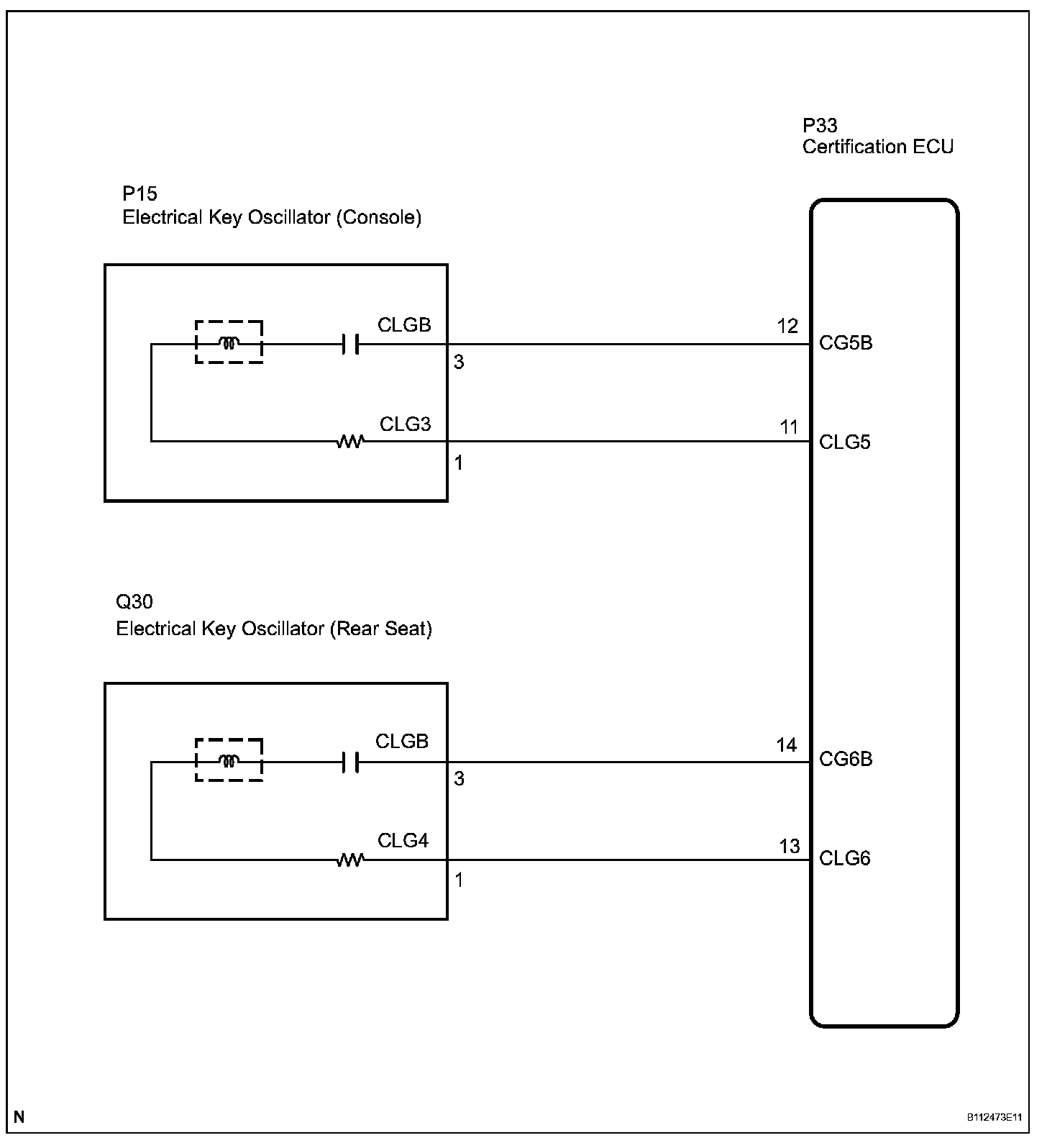 The certification ECU activates the front and rear cabin oscillators. The power is supplied from the certification ECU to both the front and rear cabin oscillators. The front and rear cabin oscillator circuits have the same wiring. If the smart access system with push-button start does not operate properly inside the vehicle, check the circuit for their oscillators.