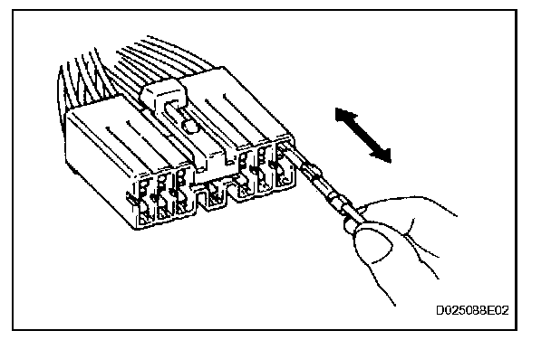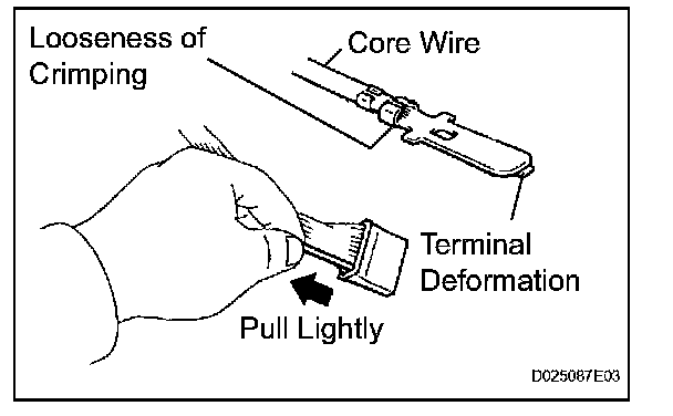 2. Checking when a connector is disconnected: Check by pulling the wire harness lightly from the backside of the connector. Look for unlatched terminals, missing terminals, loose crimps or broken conductor wires. Check visually for corrosion, metallic or foreign matter and water, and bent, rusted, overheated, contaminated, or deformed terminals.