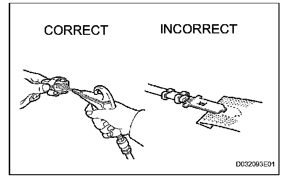 3. Checking the contact pressure of the terminal: Prepare a spare male terminal. Insert it into a female terminal, and check for ample tension when inserting and after full engagement.