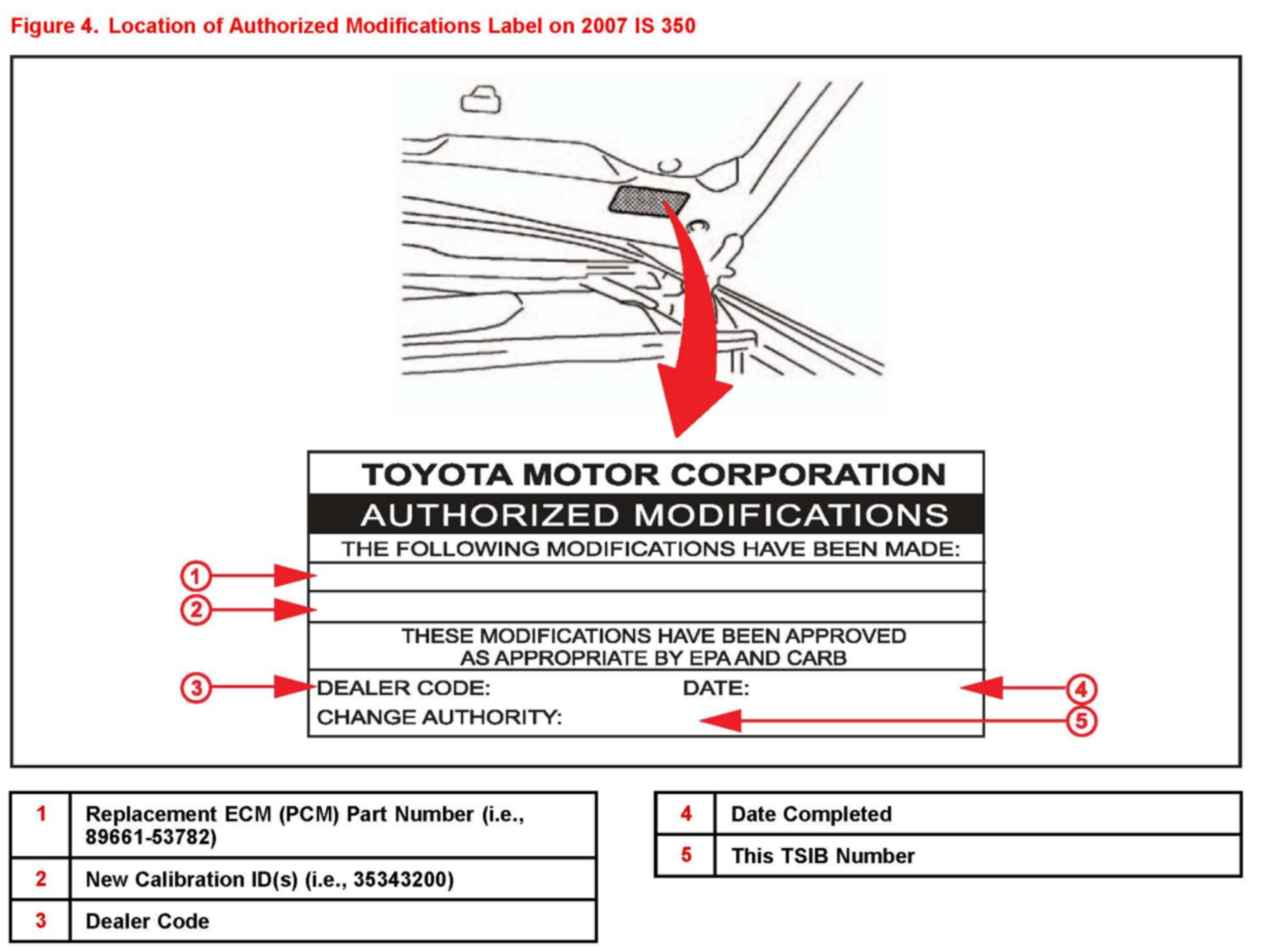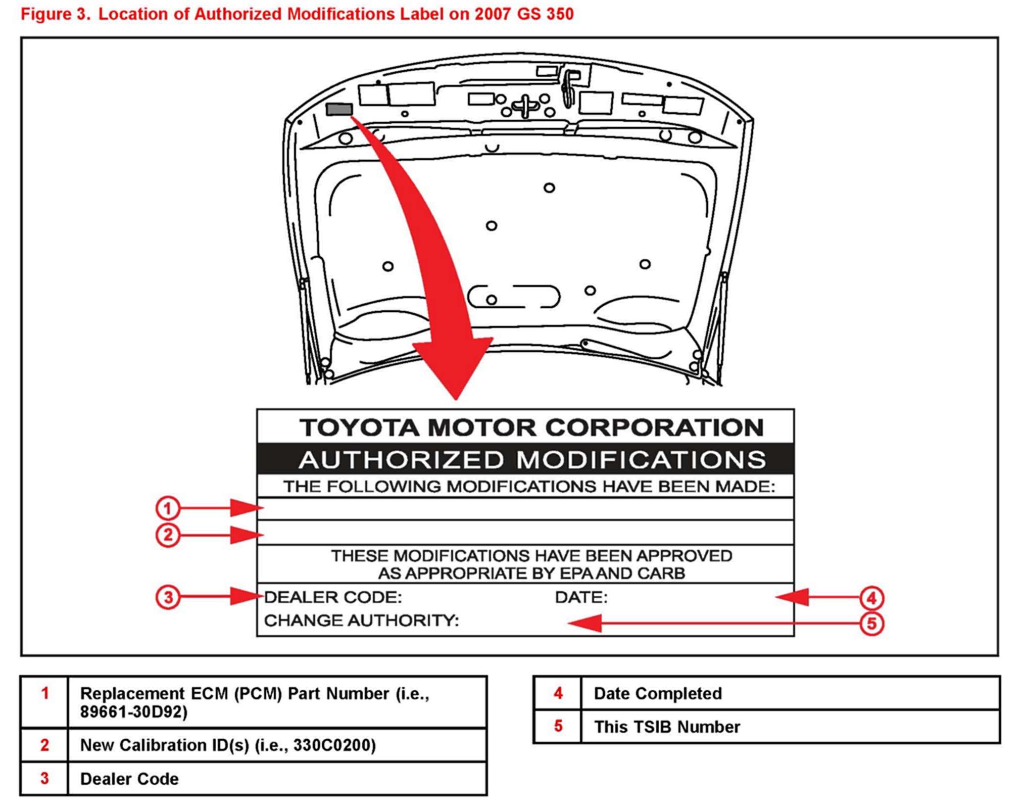 6. Check for the Authorized Modifications Label affixed to the vehicle in the location shown in Figure 3 or 4. Confirm if the ECM (PCM) calibration has been updated. If the calibration ID listed is NOT the latest ECM (PCM) calibration - go to step 7.