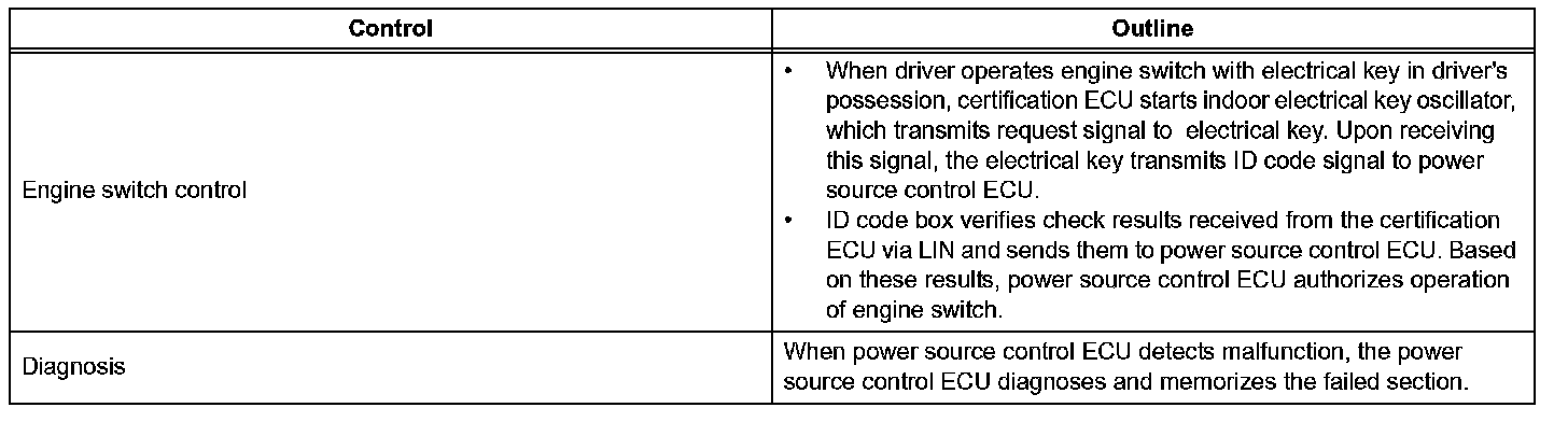 a. The push-button start uses a push-type engine switch, which the driver can operate by merely carrying the electrical key. This system consists primarily of the power source control ECU, engine switch, ID code box, steering lock ECU, electrical key, ACC relay, IG1 relay, IG2 relay and certification ECU. The power source control ECU controls the system. This function operates in cooperation with the smart access system with push-button start.
