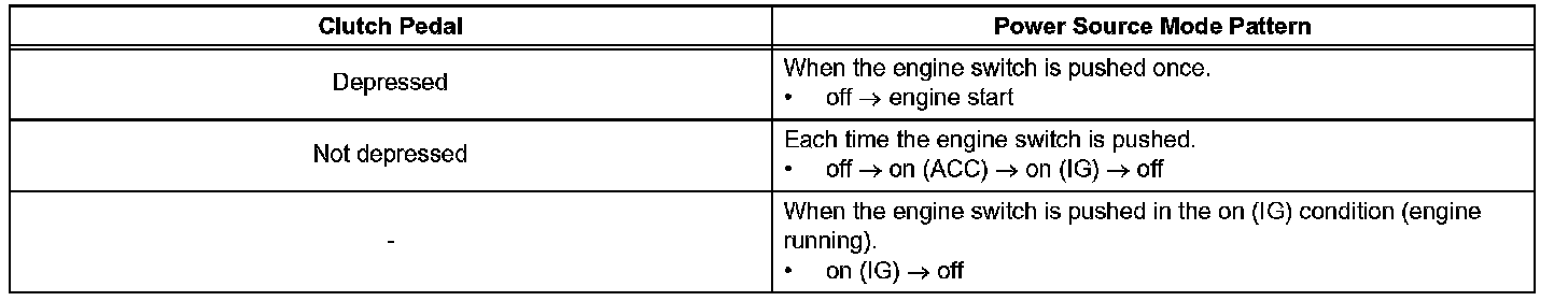 h. After the buzzer sounds, if the engine switch is pressed within 5 seconds with the brake pedal not depressed (A/T) or clutch pedal not depressed (M/ T), the power source mode changes to on (ACC) or on (IG), the same as in the normal condition.