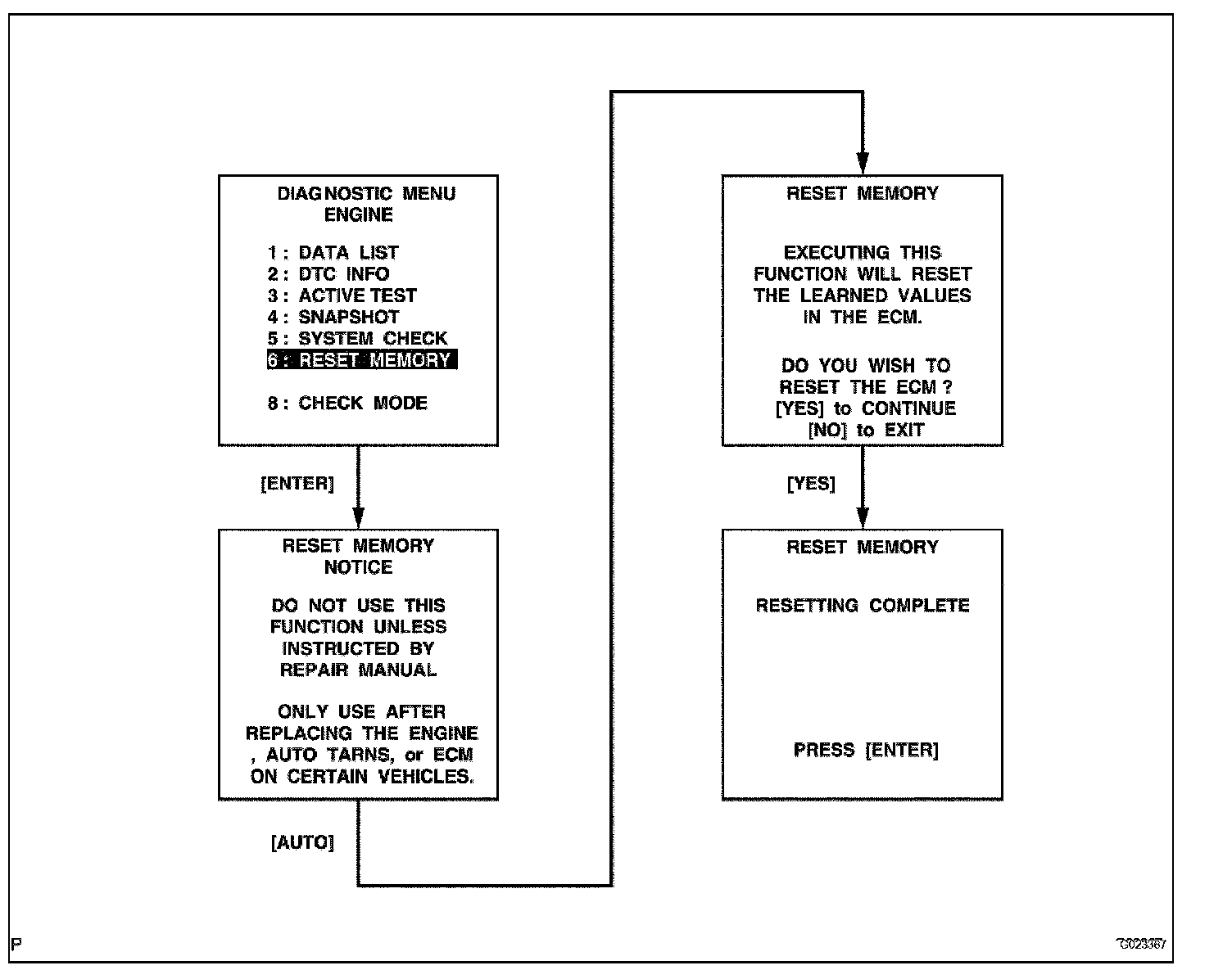 The ECM memorizes the condition that the ECT controls the automatic transmission assembly and engine assembly according to those characteristics. Therefore, when the automatic transmission assembly, engine assembly, or ECM has been replaced, it is necessary to reset the memory so that the ECM can memorize the new information.