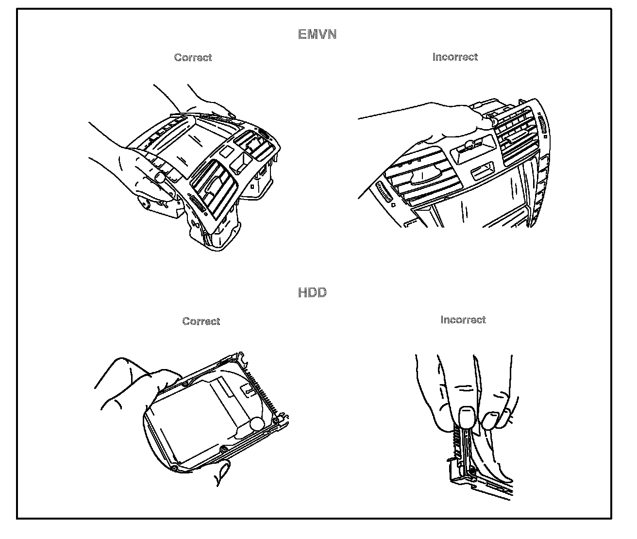 The EMVN or HDD CANNOT be swapped separately into another unit for troubleshooting purposes. These parts MUST be paired with a new or exchange unit. The EMVN and HDD unit can be installed into another vehicle ONLY AS A COMPLETE UNIT for diagnostic purposes.
