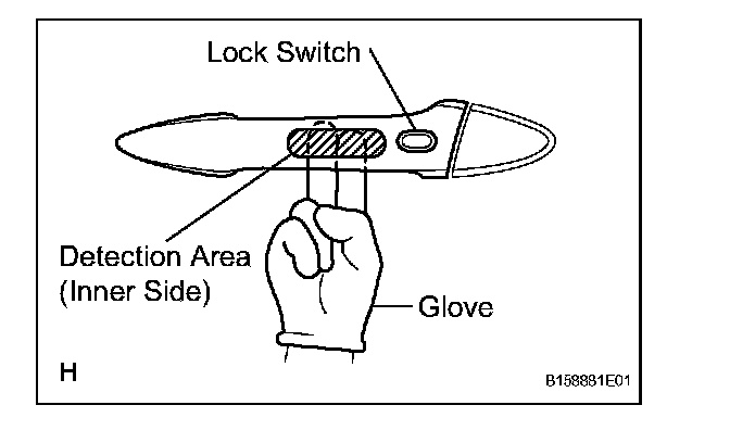 5. Step 5: Inspect the door electrical key oscillator's response sensitivity. Wear protective gloves, set the system to unlock standby mode, and check that touching the inner side of the outside handle (the highlighted area in the illustration) with your finger causes the door to unlock.