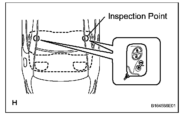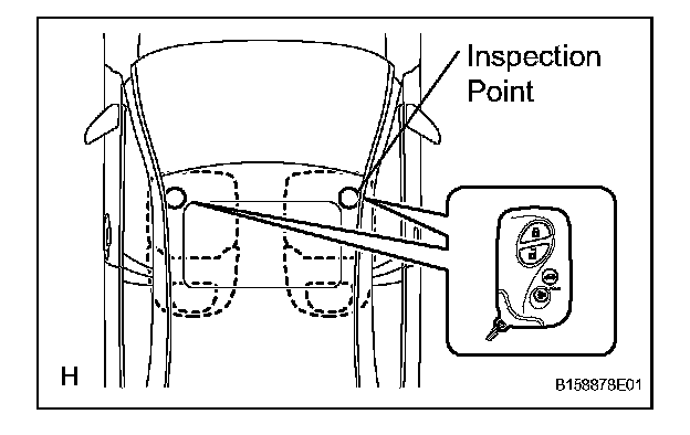 4. Inspect the entry ignition operation's detection area (rear seat). Pay attention to the direction of the key in the illustration. When the key is in either of the 2 locations in the illustration, check that the engine can start.