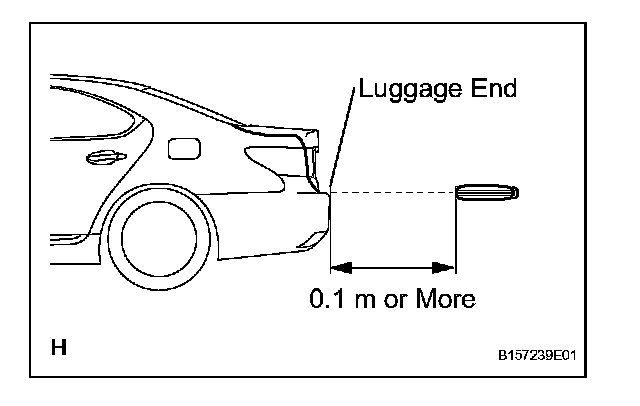 3. Inspect the key lock-in prevention's detection area and the entry door control receiver for wave leaks. Hold the key at the same height as the lower edge of the luggage compartment door and aligned with the center of the rear of the vehicle. Pay attention to the direction and position of the key shown in the illustration. Check that when the key is over 0.1 m (0.3 ft.) from the vehicle's rear bumper, the wireless buzzer does not sound. If the warning buzzer sounds, the entry door control receiver may have a wave leak.