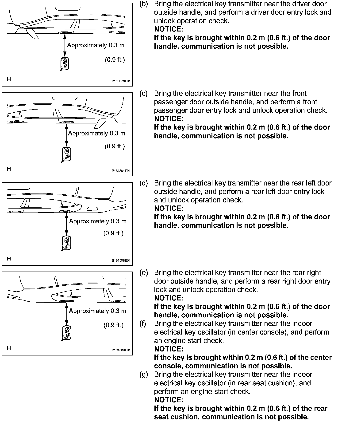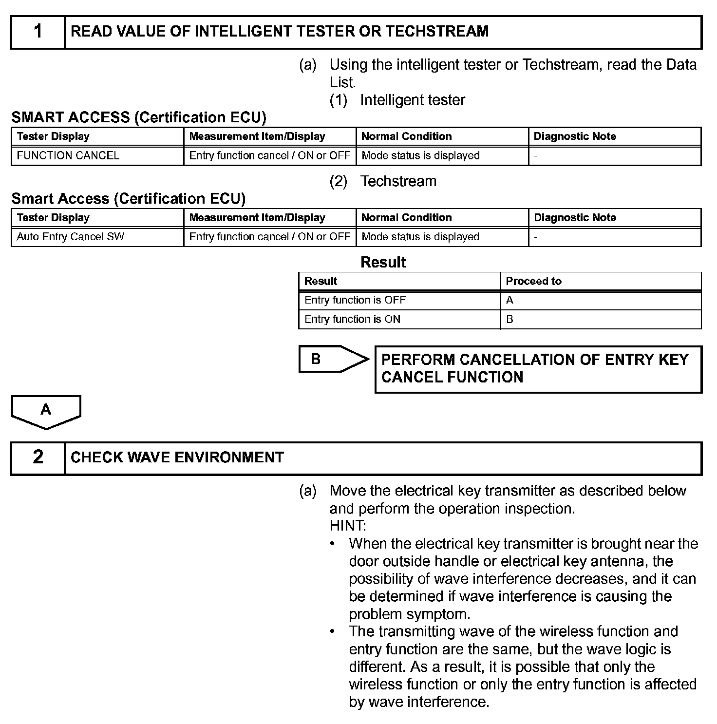 When the wireless operation can be used to lock and unlock the doors, the communication line between the door control receiver and certification ECU is normal. When the entry operation does not operate, one of the following may be the cause: 1) entry cancel function is set through customization; 2) malfunction in smart access system communication line (electrical key transmitter and vehicle); or 3) wave interference.