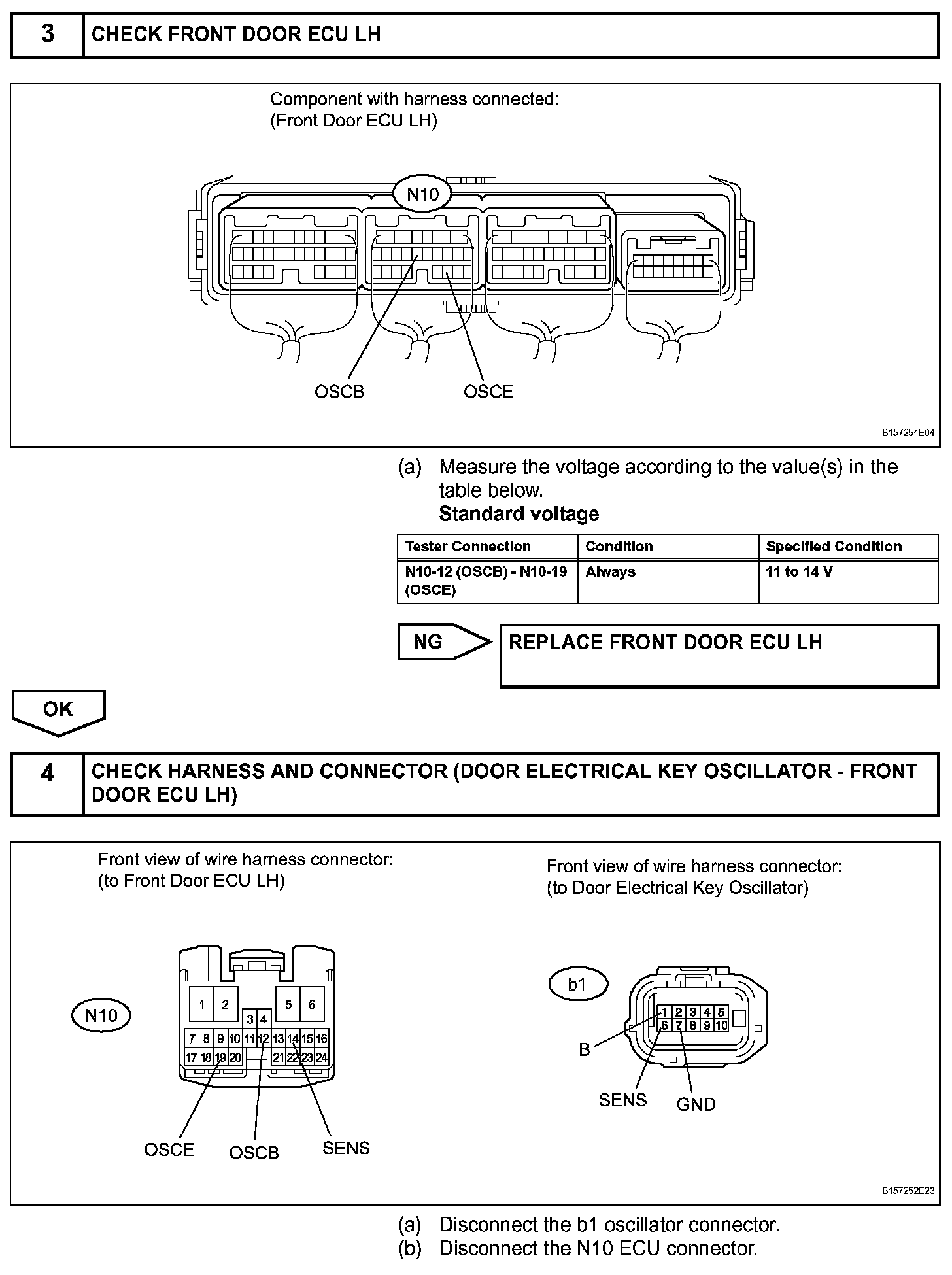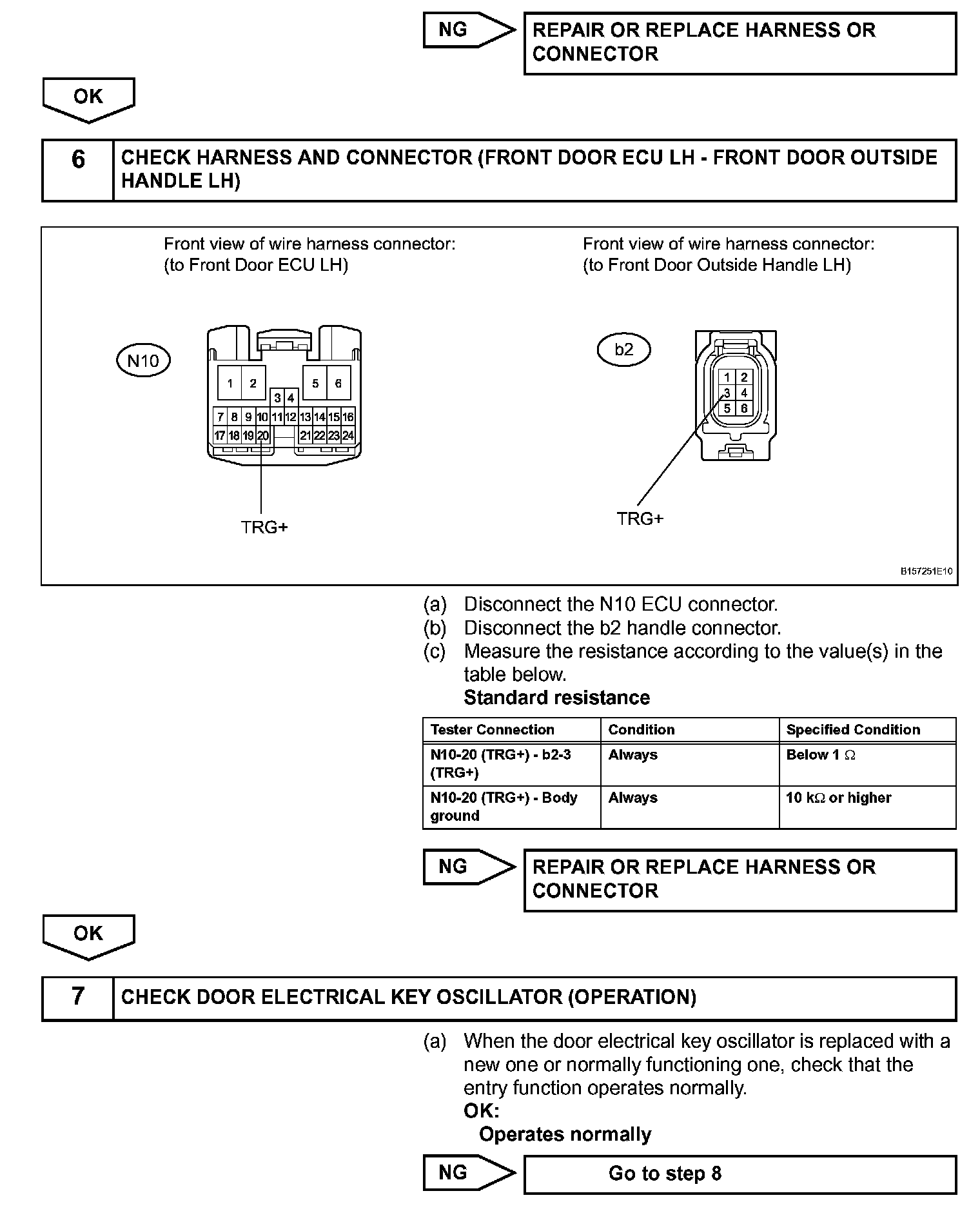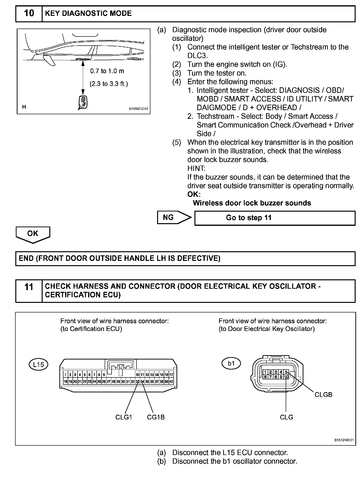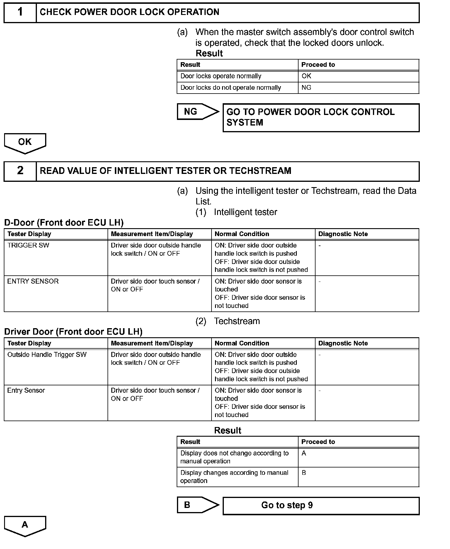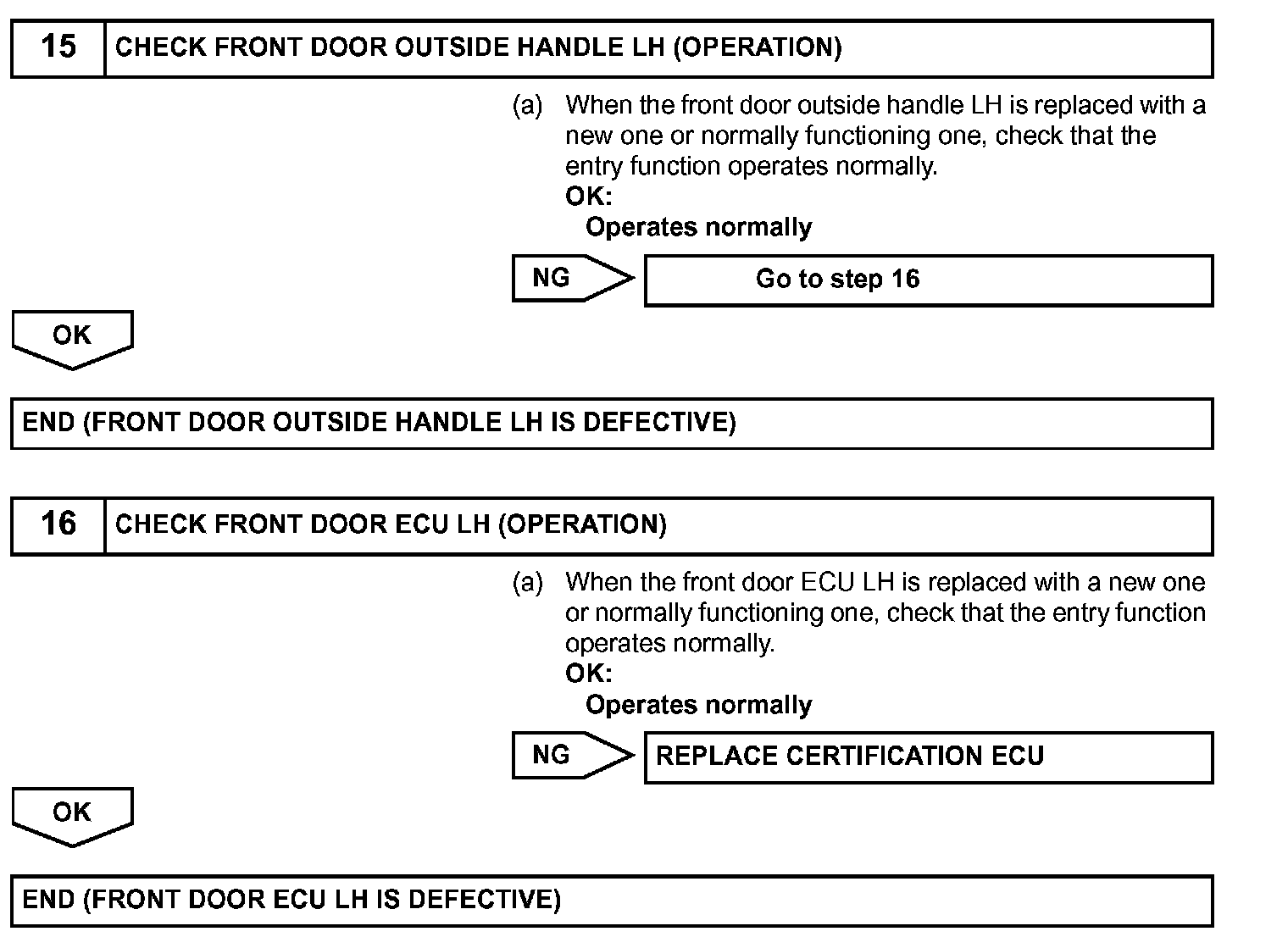 When the driver door entry lock and unlock functions do not operate, one of the following may be malfunctioning: 1) power door lock system, 2) driver side door electrical key oscillator, or 3) certification ECU.