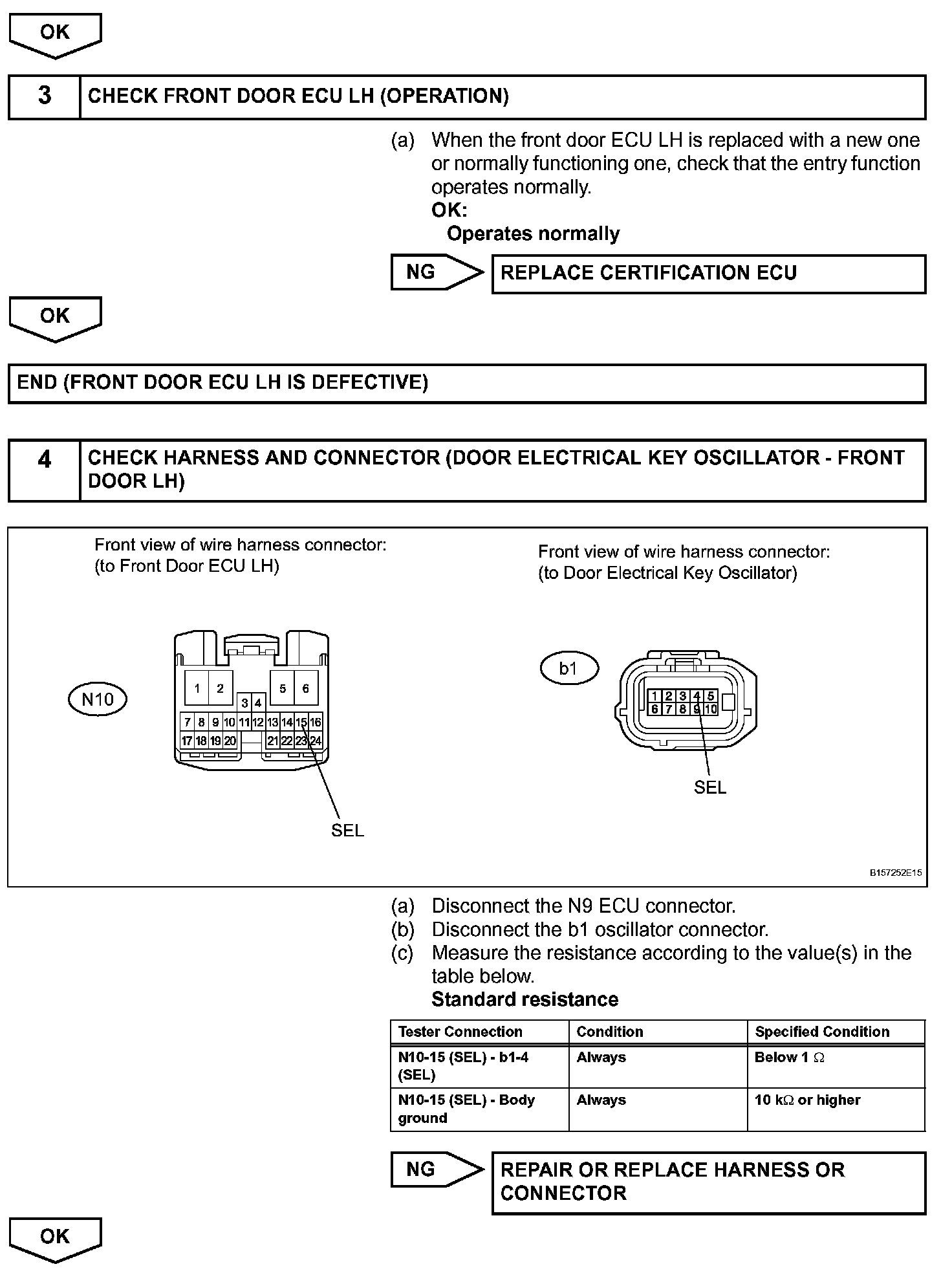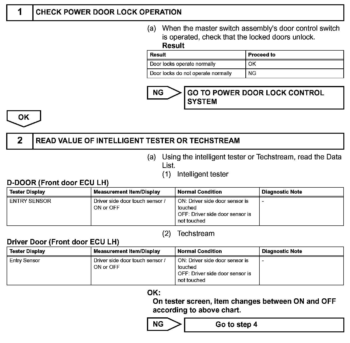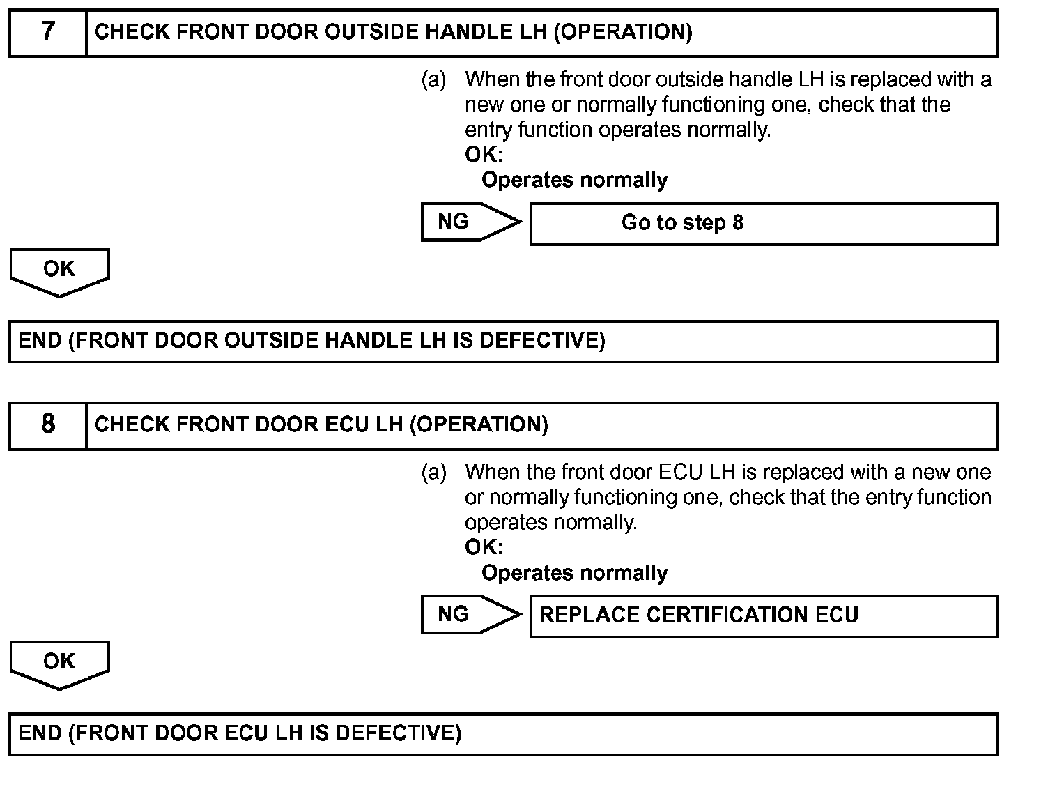 If the driver door entry unlock function does not operate but the entry lock operation operates, the communication line between the vehicle and electrical key transmitter is normal. Either of the following may have occurred: 1) the door outside handle touch sensor is malfunctioning; or 2) the front door ECU LH receives the door outside handle touch sensor ON signal, but is unable to send the signal to the certification ECU through CAN communication.