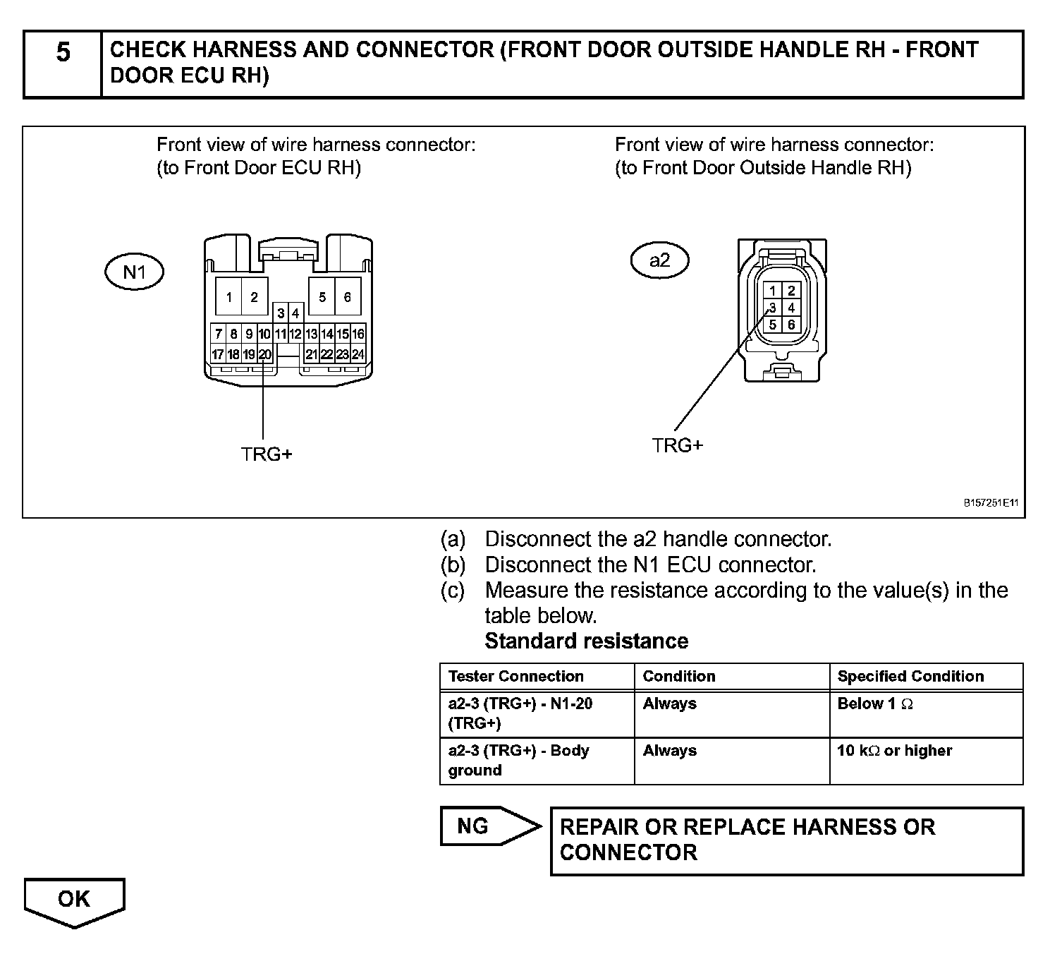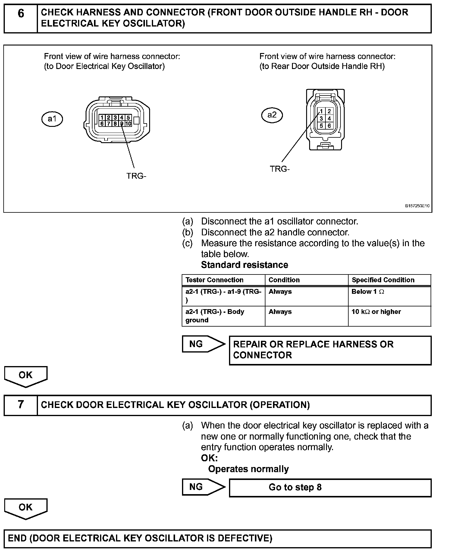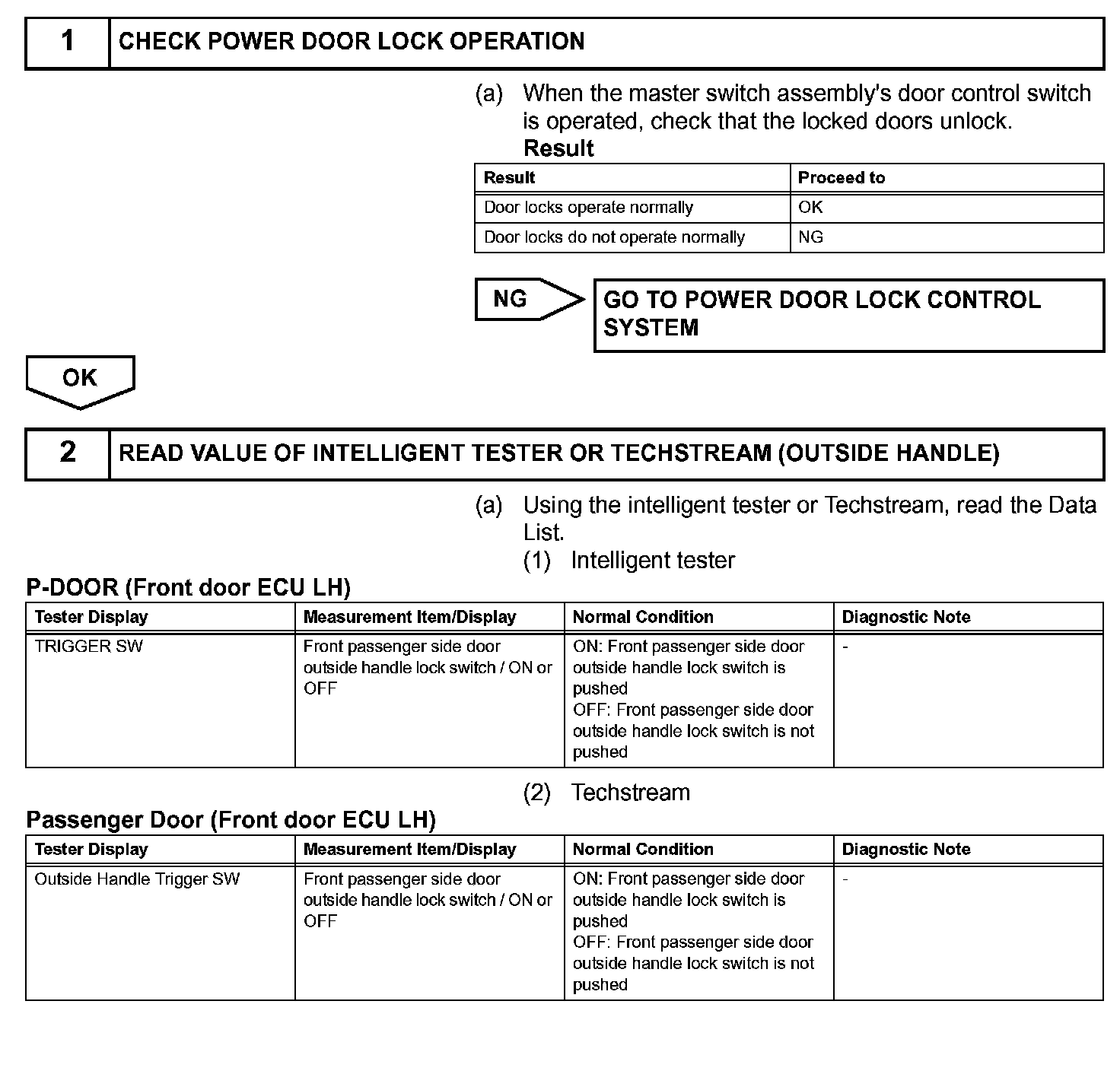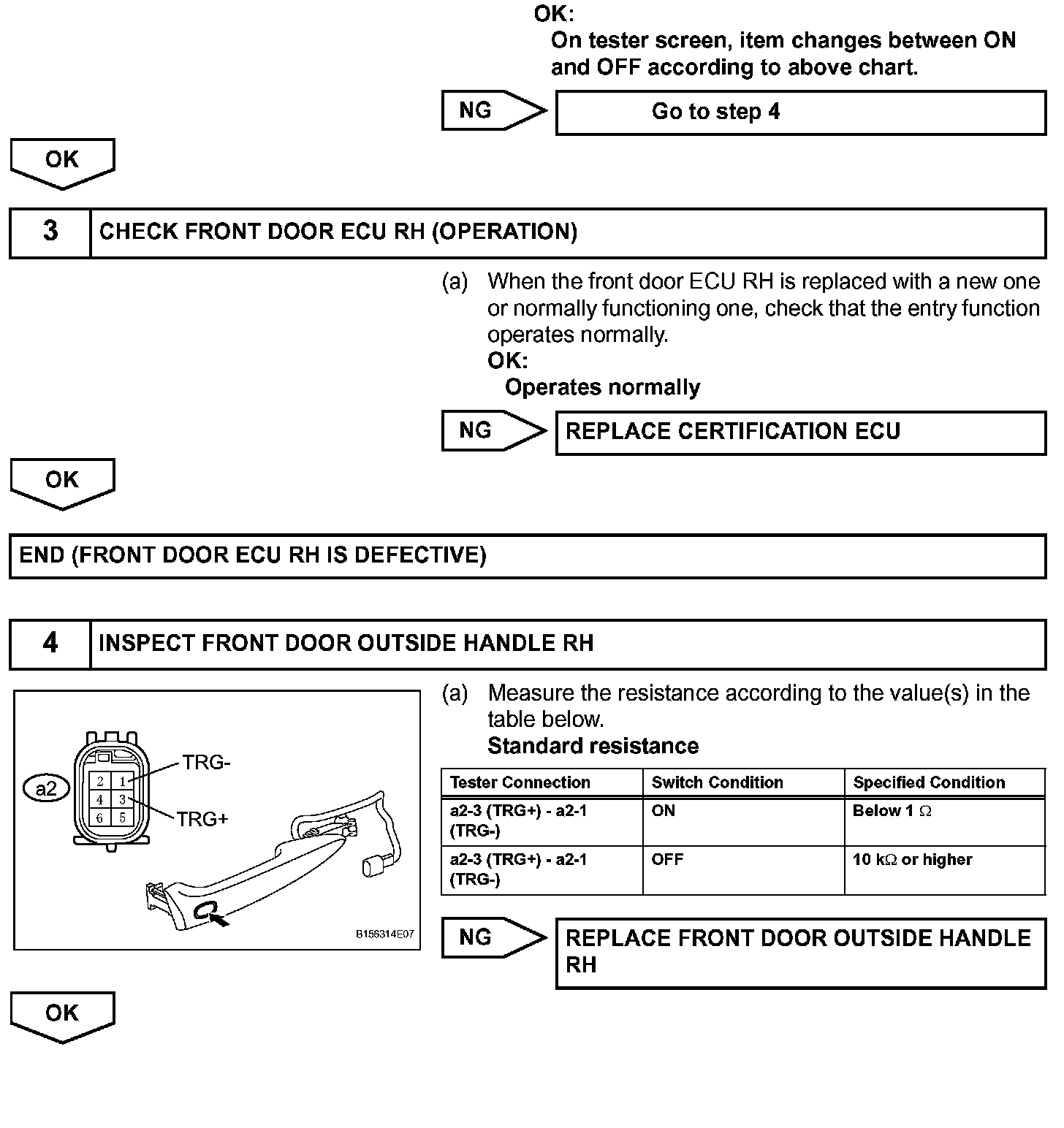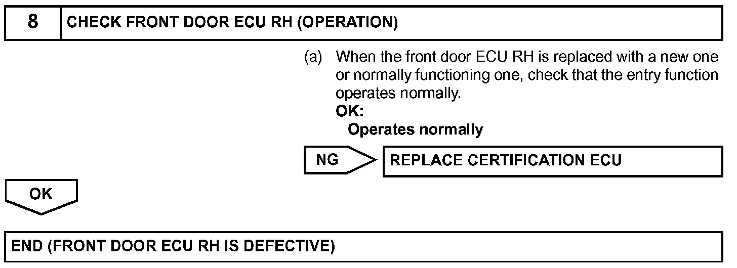 If the front passenger door entry lock function does not operate but the entry unlock operation operates, the communication line between the vehicle and electrical key transmitter is normal. Either of the following may have occurred: 1) the entry lock switch is malfunctioning; or 2) the front door ECU RH receives the entry lock switch ON signal, but is unable to send the signal to the certification ECU through CAN communication.