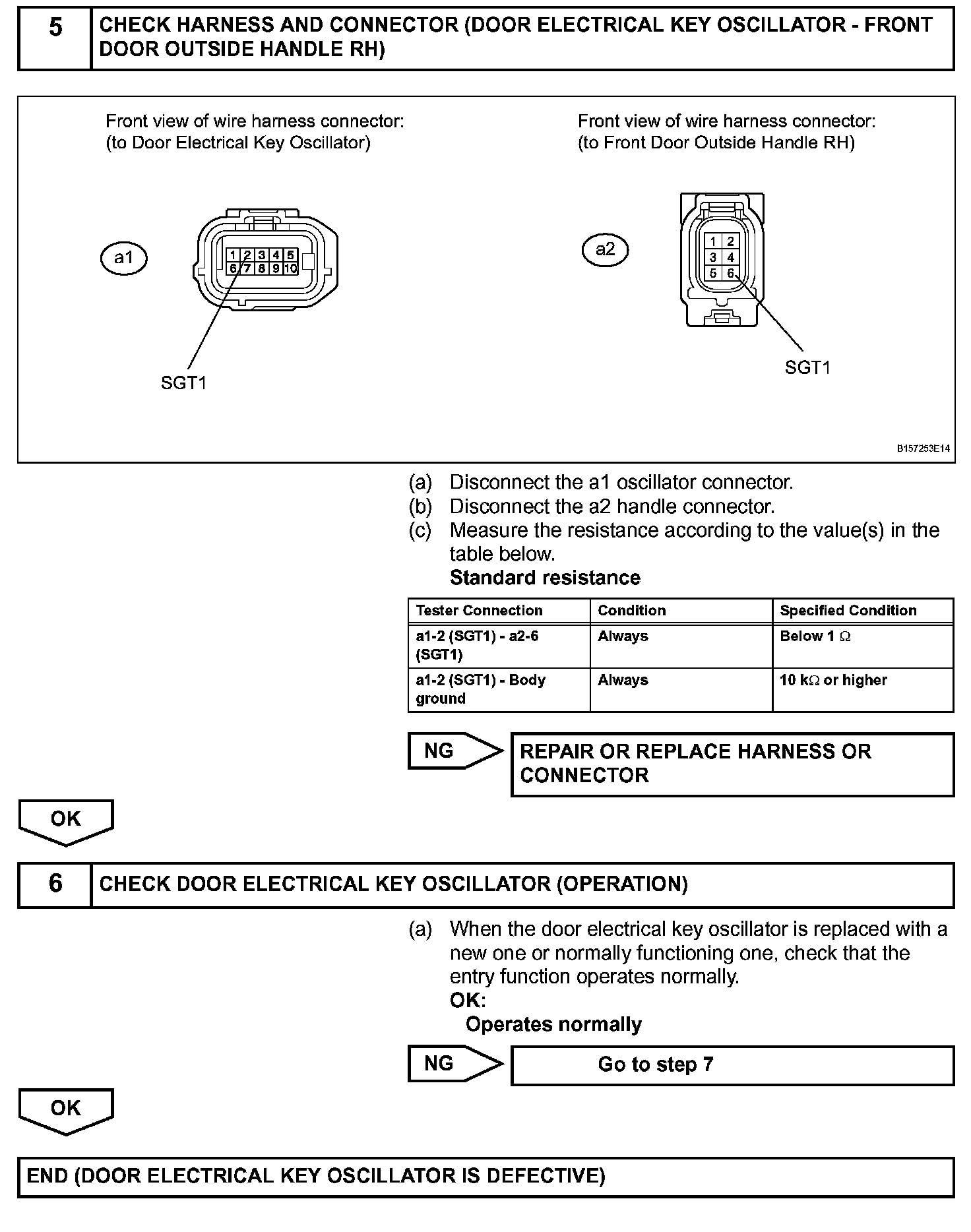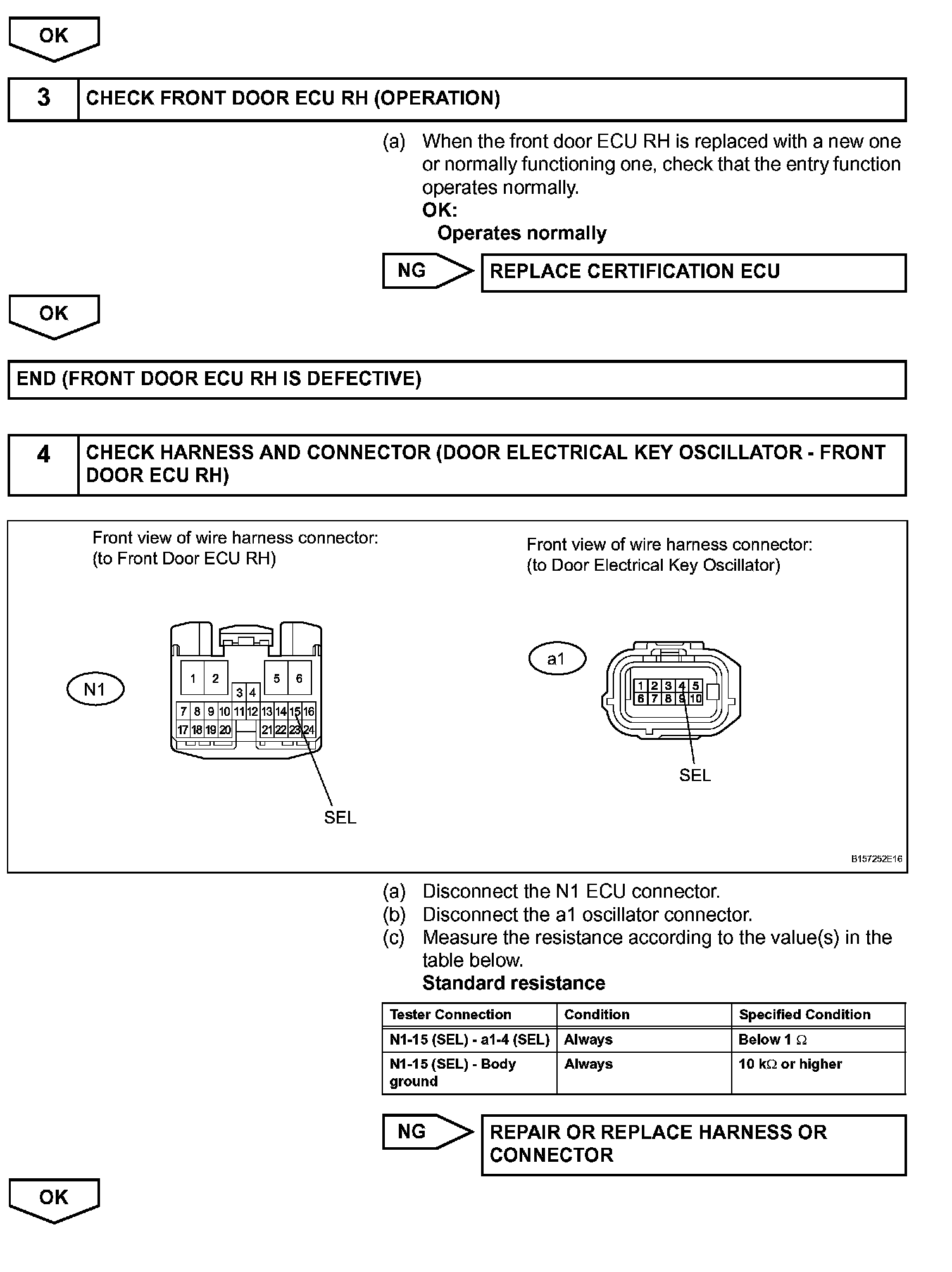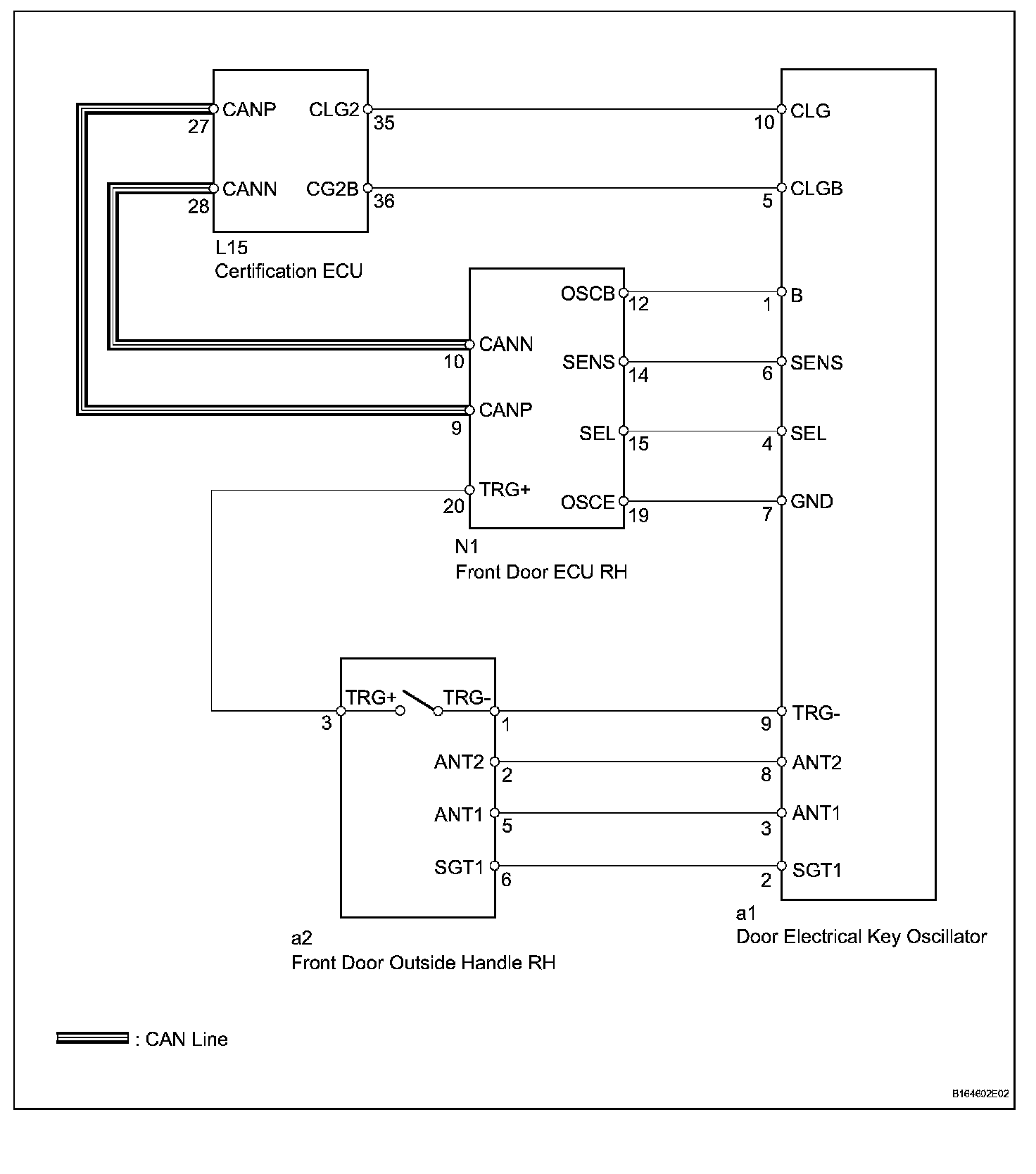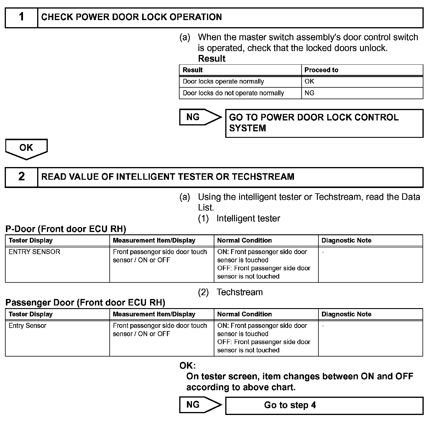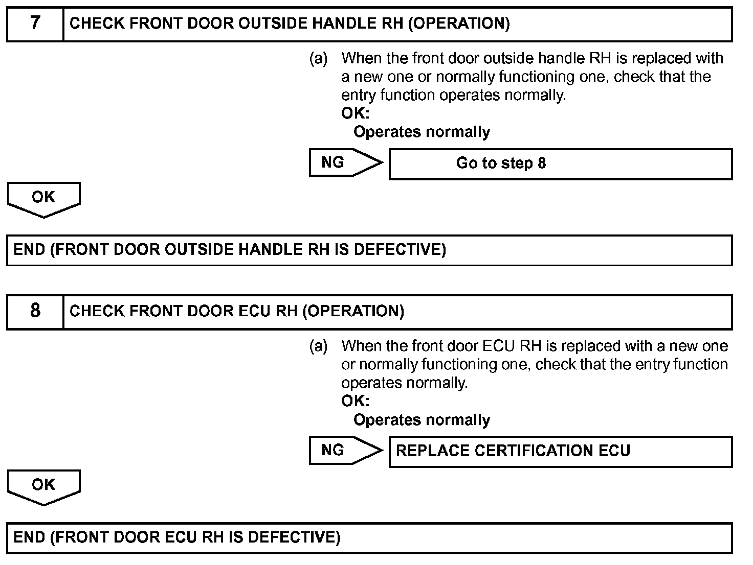 If the front passenger door entry unlock function does not operate but the entry lock operation operates, the communication line between the vehicle and electrical key transmitter is normal. Either of the following may have occurred: 1) the door outside handle touch sensor is malfunctioning; or 2) the front door ECU RH receives the door outside handle touch sensor ON signal, but is unable to send the signal to the certification ECU through CAN communication.