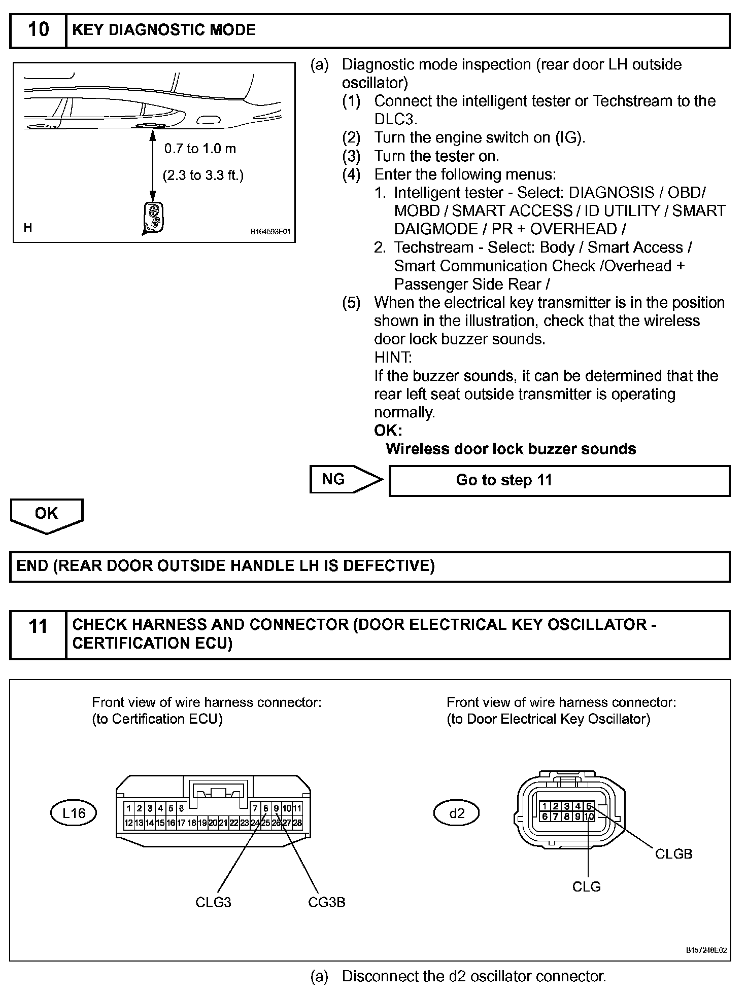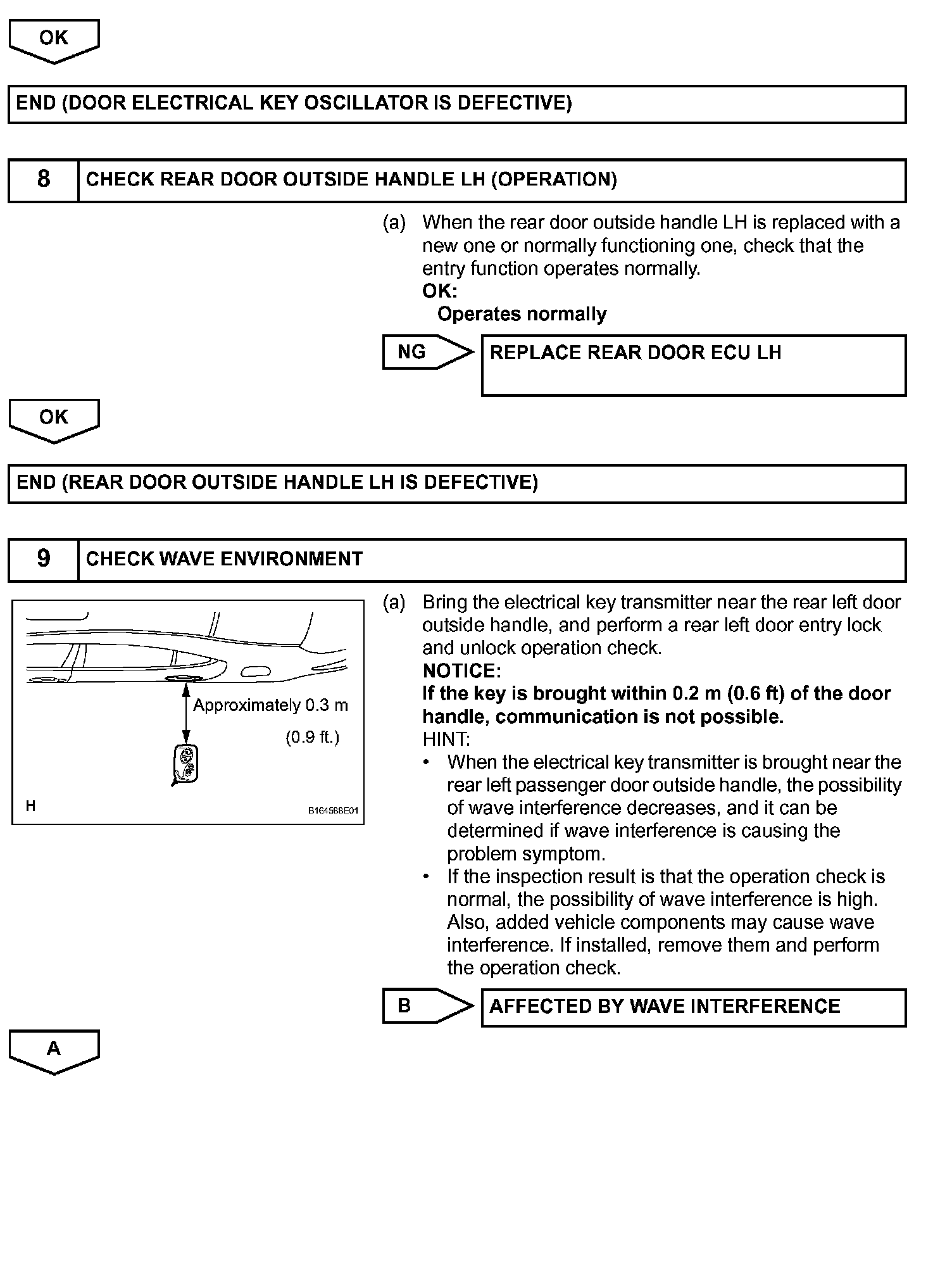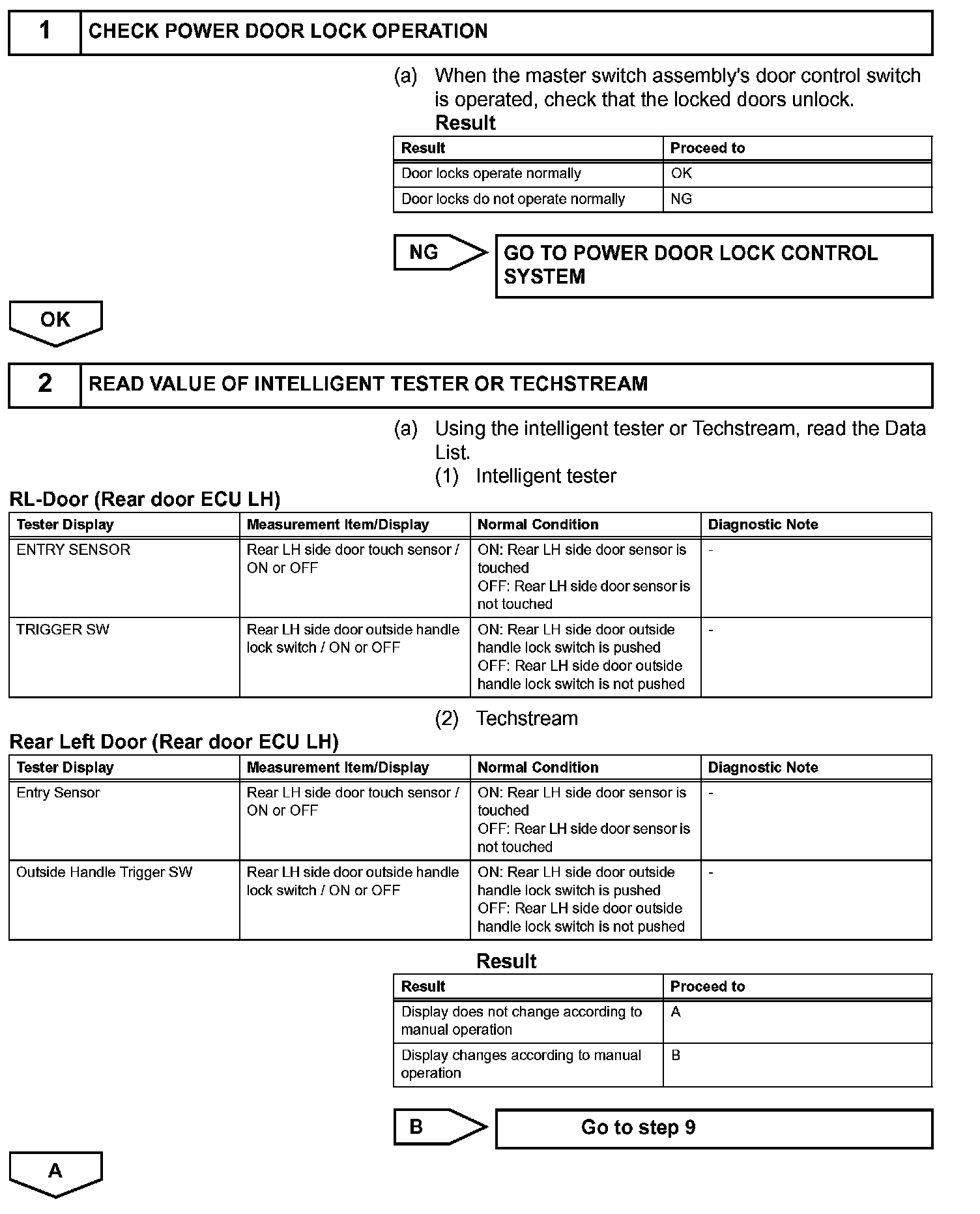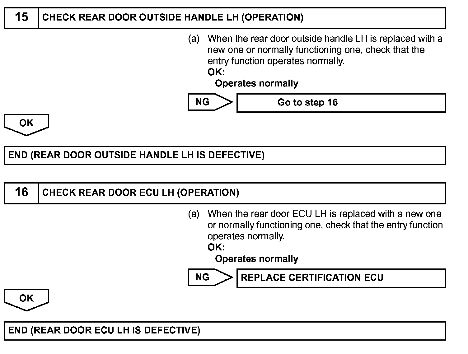 When the rear door LH entry lock and unlock functions do not operate, one of the following may be malfunctioning: 1) power door lock system, 2) rear door LH electrical key oscillator, or 3) certification ECU.