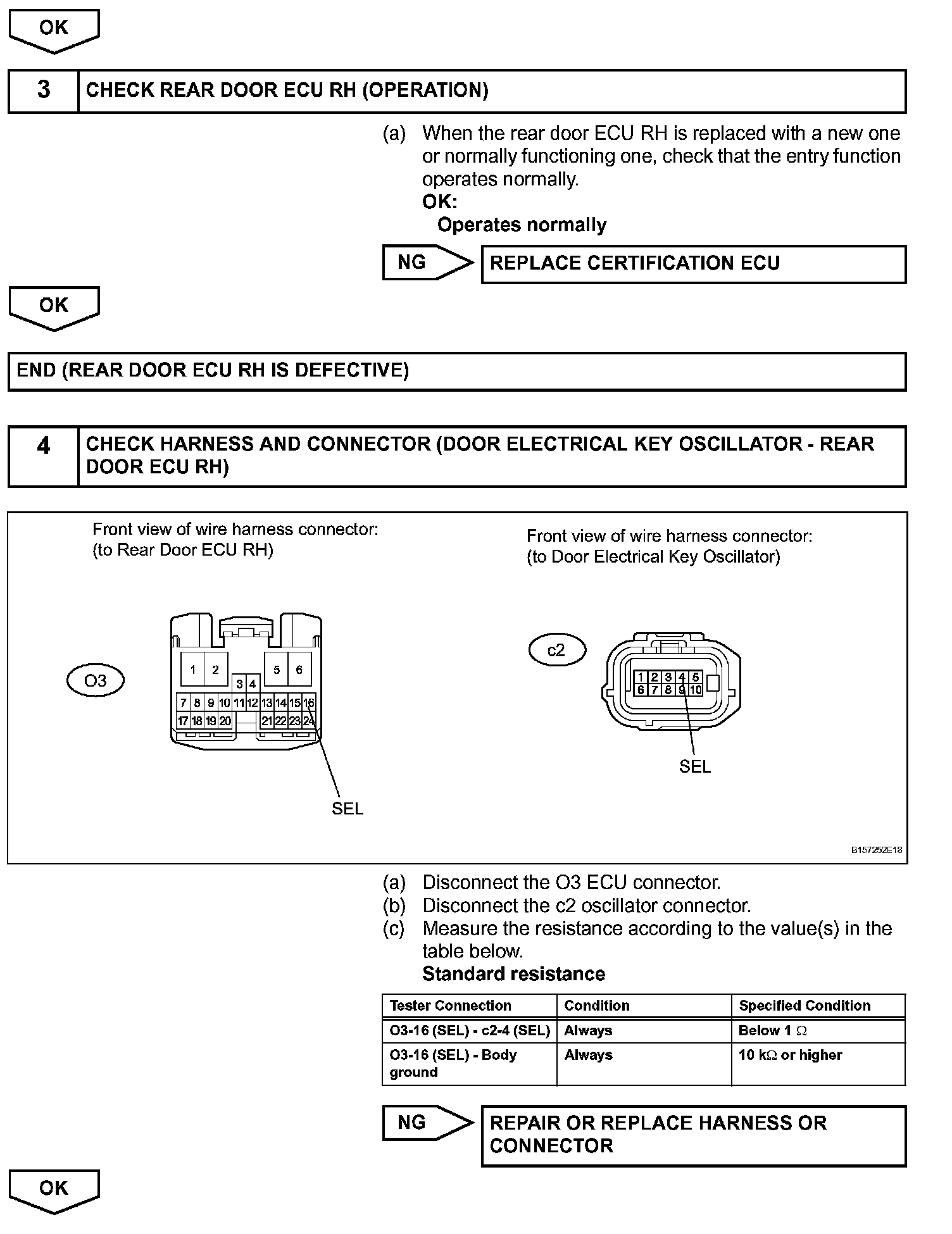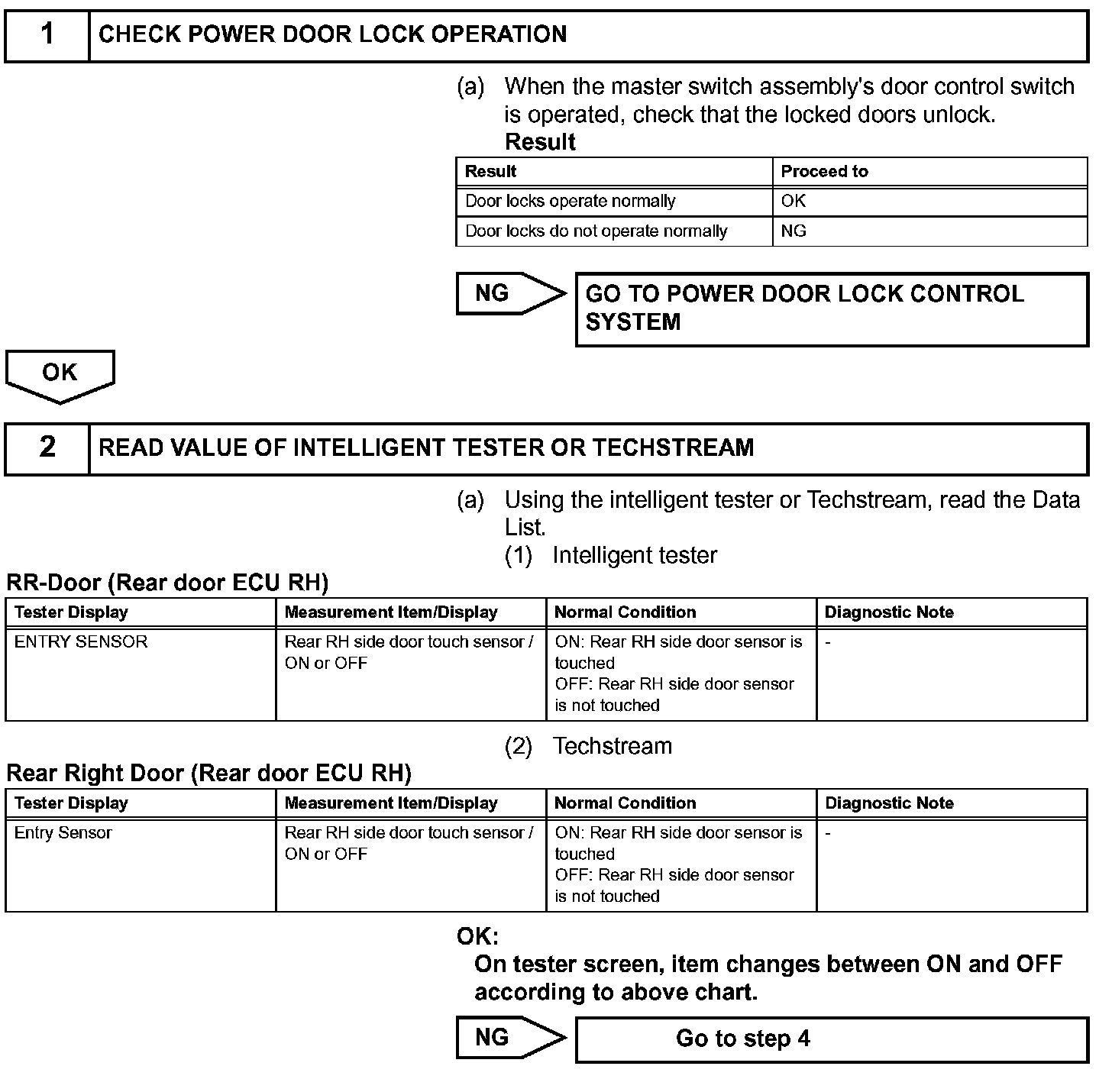 If the rear right door entry unlock function does not operate but the entry lock operation operates, the communication line between the vehicle and electrical key transmitter is normal. Either of the following may have occurred: 1) the door outside handle touch sensor is malfunctioning; or 2) the rear door ECU RH receives the door outside handle touch sensor ON signal, but is unable to send the signal to the certification ECU through CAN communication.