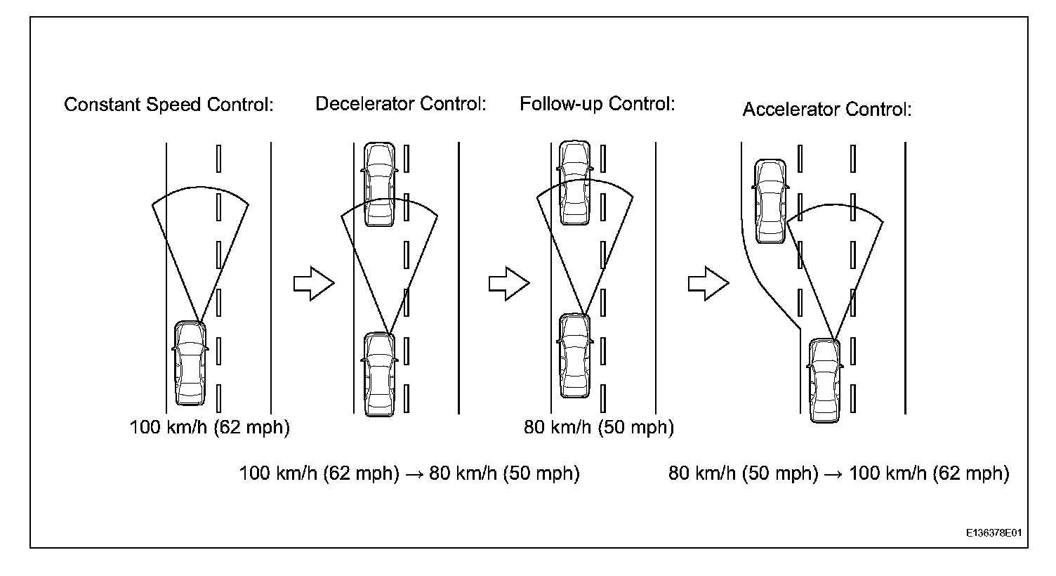 c. The constant speed control mode is designed to maintain a constant cruising speed. The vehicle-to-vehicle distance control mode is designed to control cruising using a constant speed function, deceleration cruising function, follow-up cruising function and acceleration cruising function.