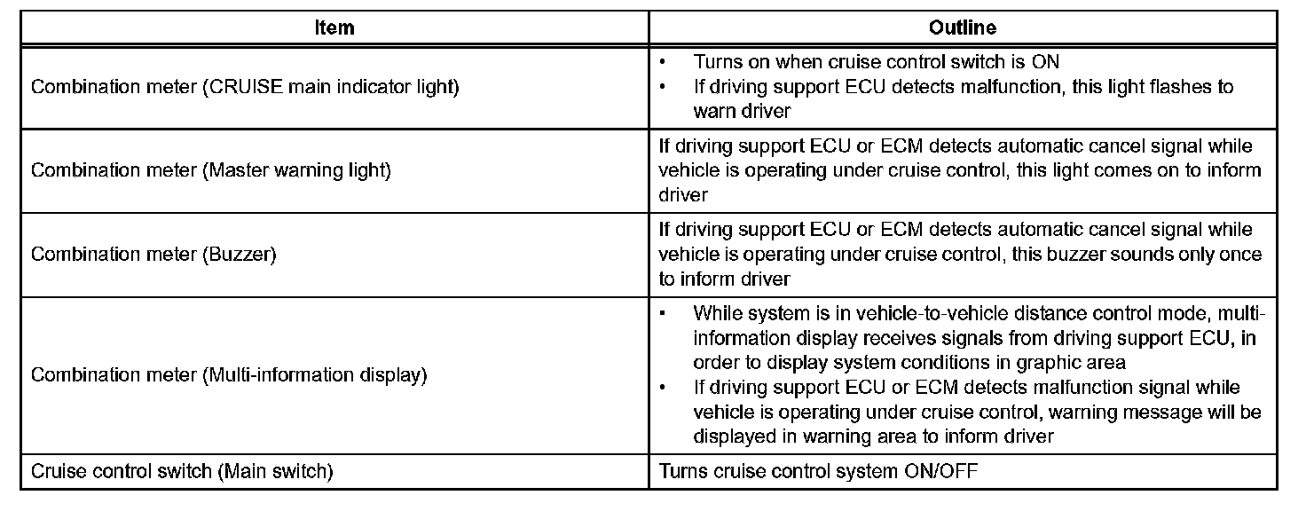 The cruise control switch operates 8 functions: SET, COAST, TAP-DOWN, RESUME, ACCEL, TAP-UP, CANCEL, and MODE. The SET, TAP-DOWN and COAST functions, and the RESUME, TAP-UP and ACCEL functions are operated with the same switch. The cruise control switch is an automatic return type switch which turns on only while operating it in each arrow direction and turns off after releasing it. The dynamic radar cruise control system has two cruise control modes: the constant speed control mode and vehicle-to-vehicle distance control mode.